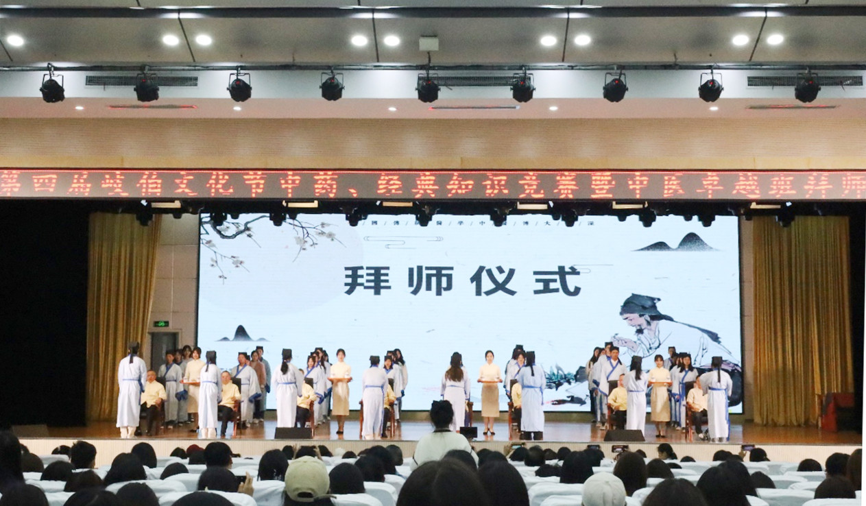4月28日,第四届岐伯文化节经典、中药知识竞赛暨卓越班拜师仪式在北校区举行,副校长商碧辉、梁晓峰及各学院院长、师生代表参加了活动。