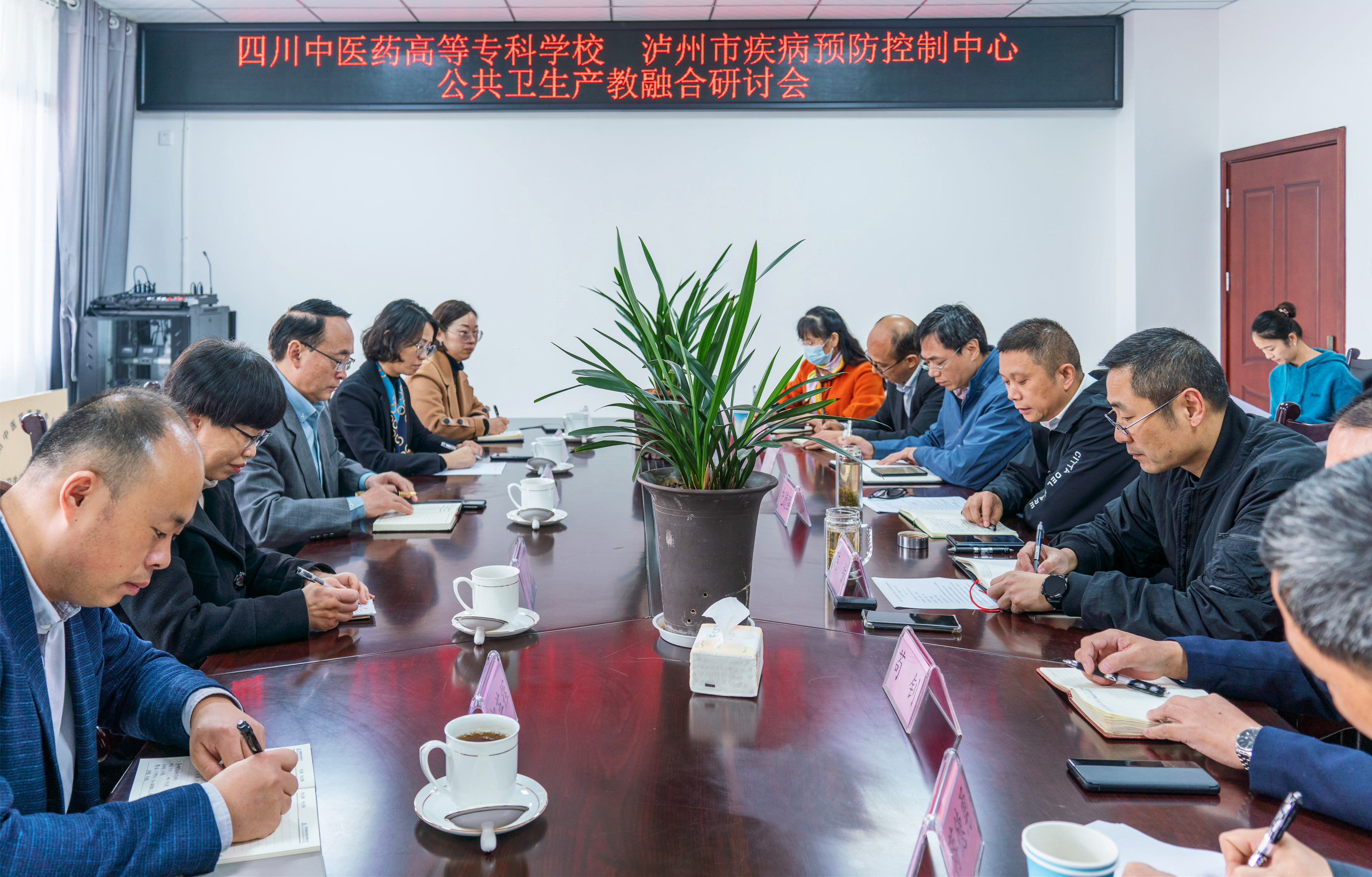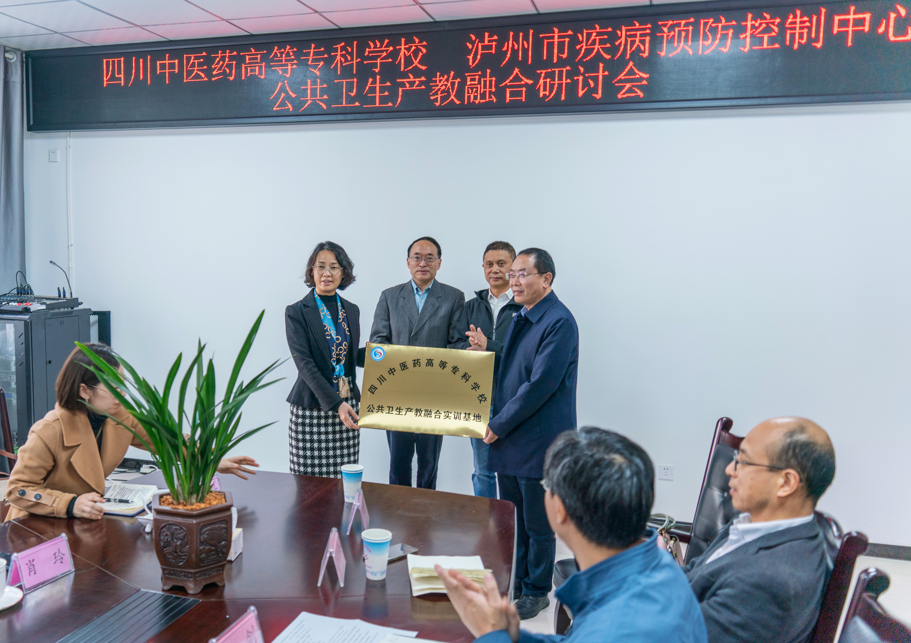 11月18日,我校与泸州市疾病预防控制中心共建公共卫生产教融合实训基地挂牌仪式暨公共卫生产教融合研讨会在泸州举行,校党委书记秦晓明、副校长肖玲、教务处长曹艳霞,泸州市疾病预防控制中心党委书记、主任先德强,副主任陈航,党委副书记喻剑,副主任苟钊及双方相关人员参加了本次活动。