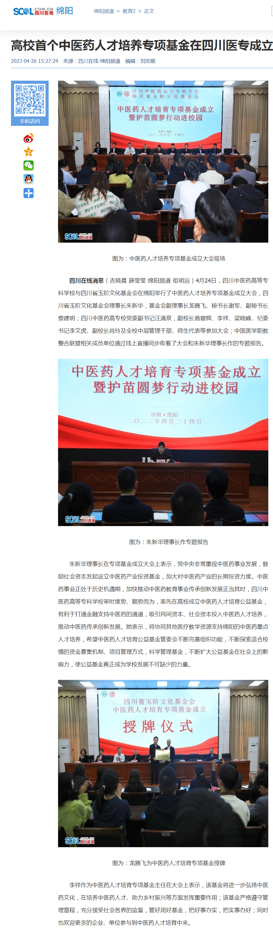 上一篇: 中国新闻网:高校首个中医药人才培养专项基金在四川中医药高等专科学校成立
