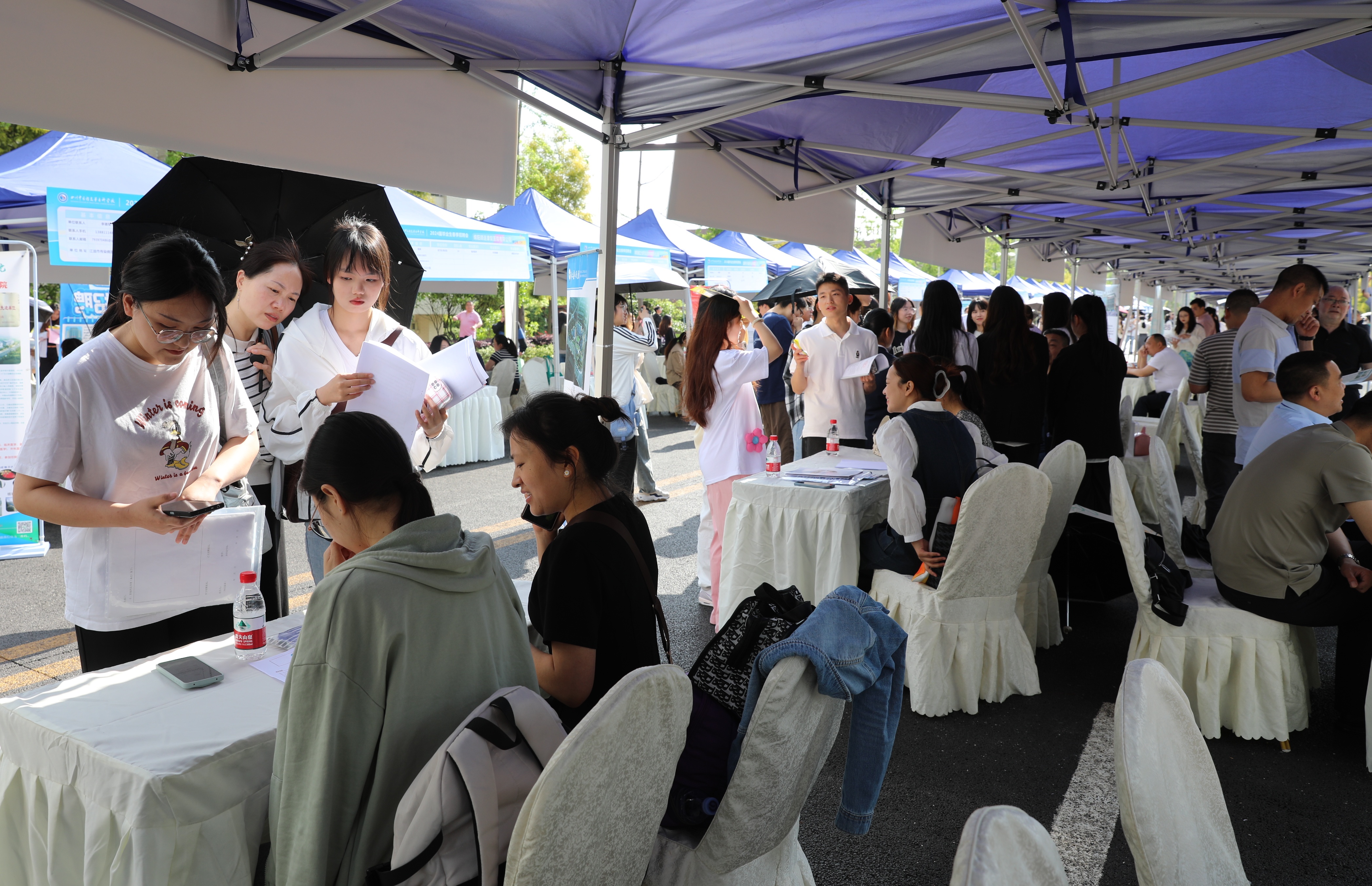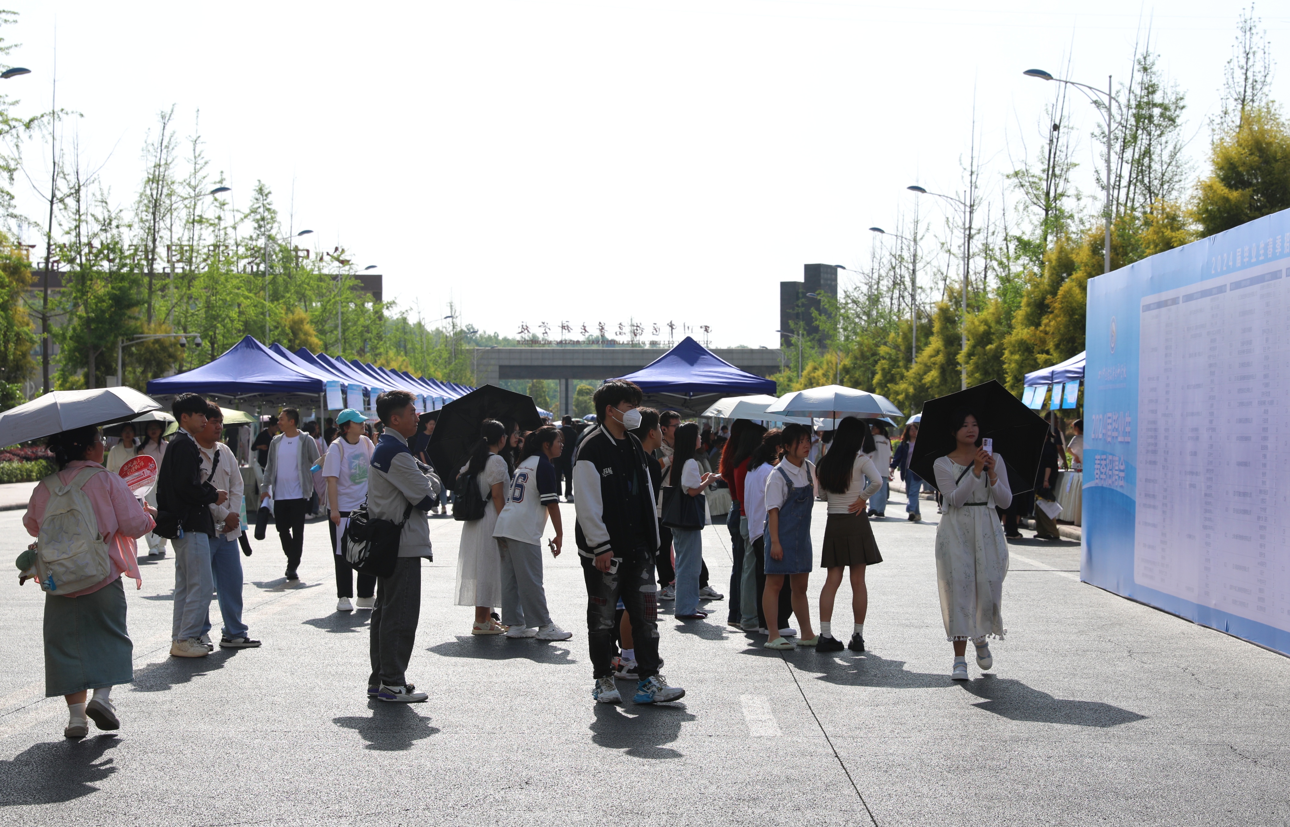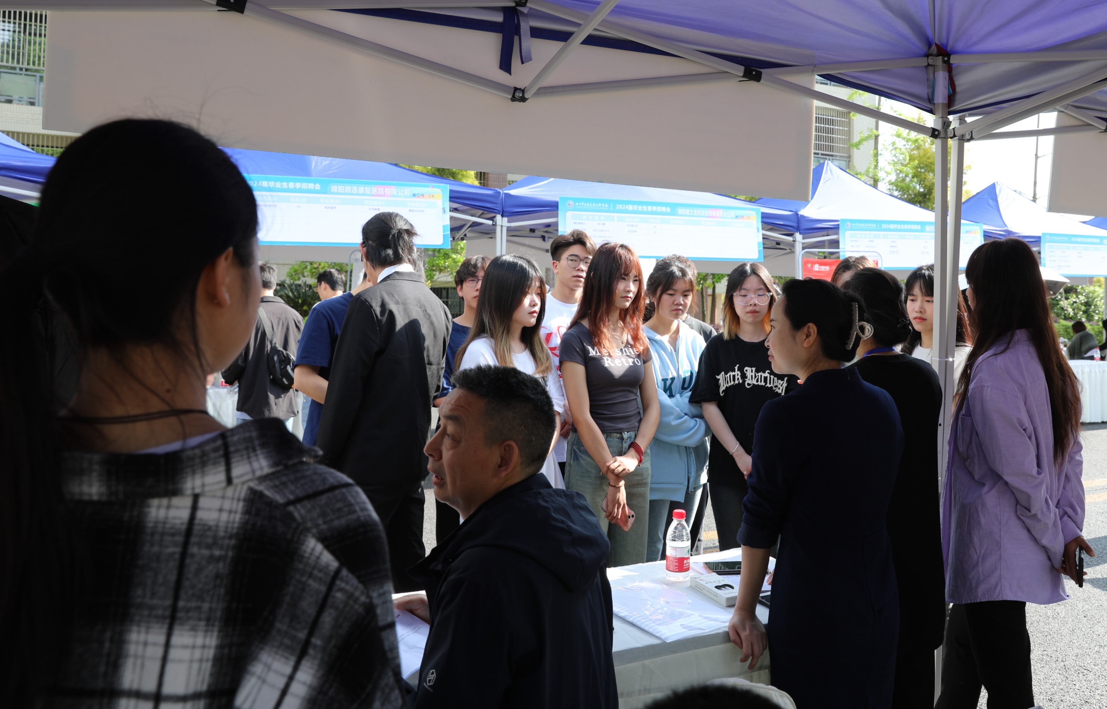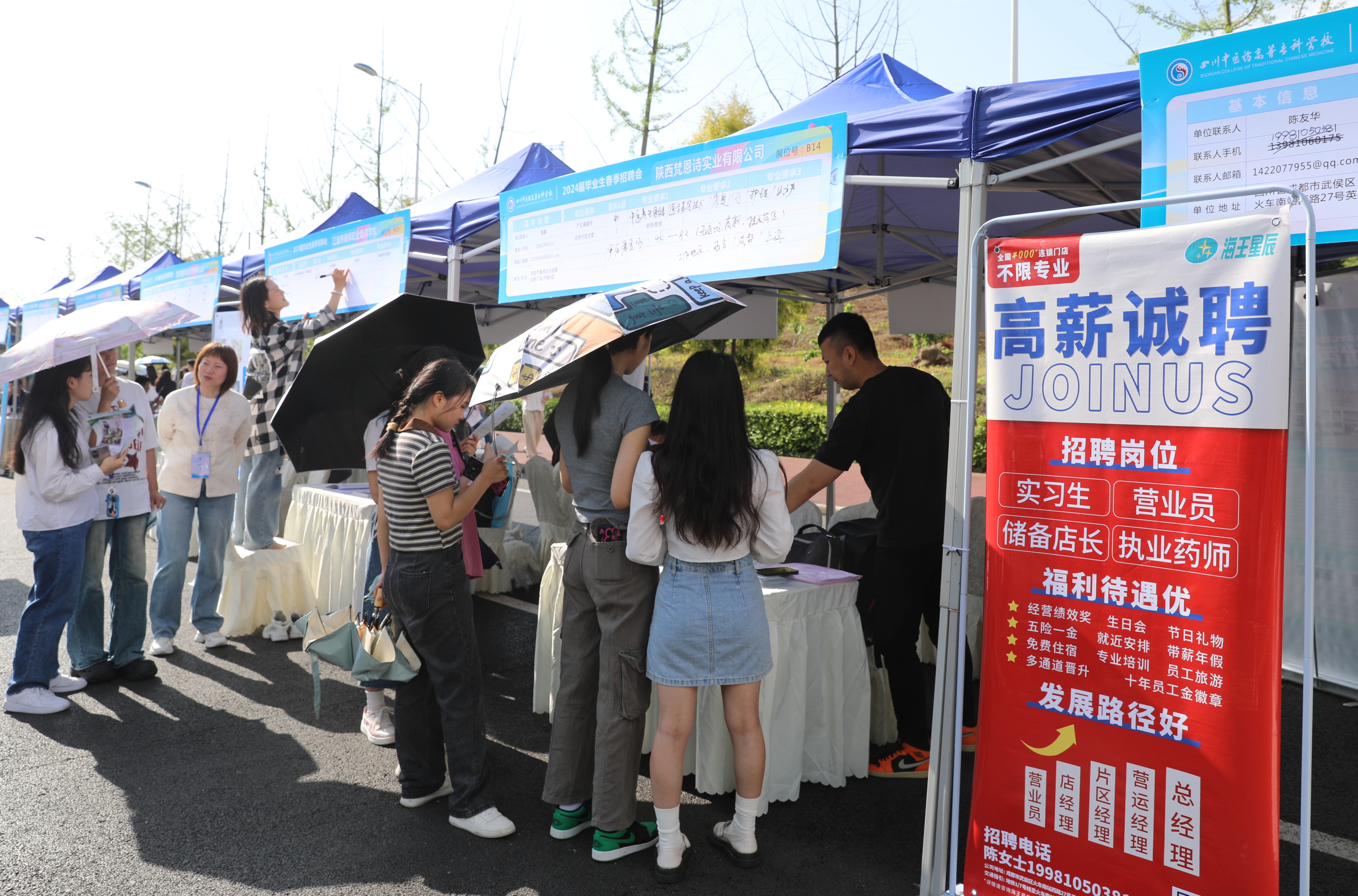 4月19日,我校在南校区银杏大道举办2024届毕业生春季校园招聘会,2024届毕业生及2025届实习生参加。来自全国各地医疗单位、药企、康养产业代表120余家,提供岗位274个,岗位需求2371人,吸引了2100余名学生参加;涉及临床医学、中医、护理、药学、康复治疗、医学影像、老年服务等专业。