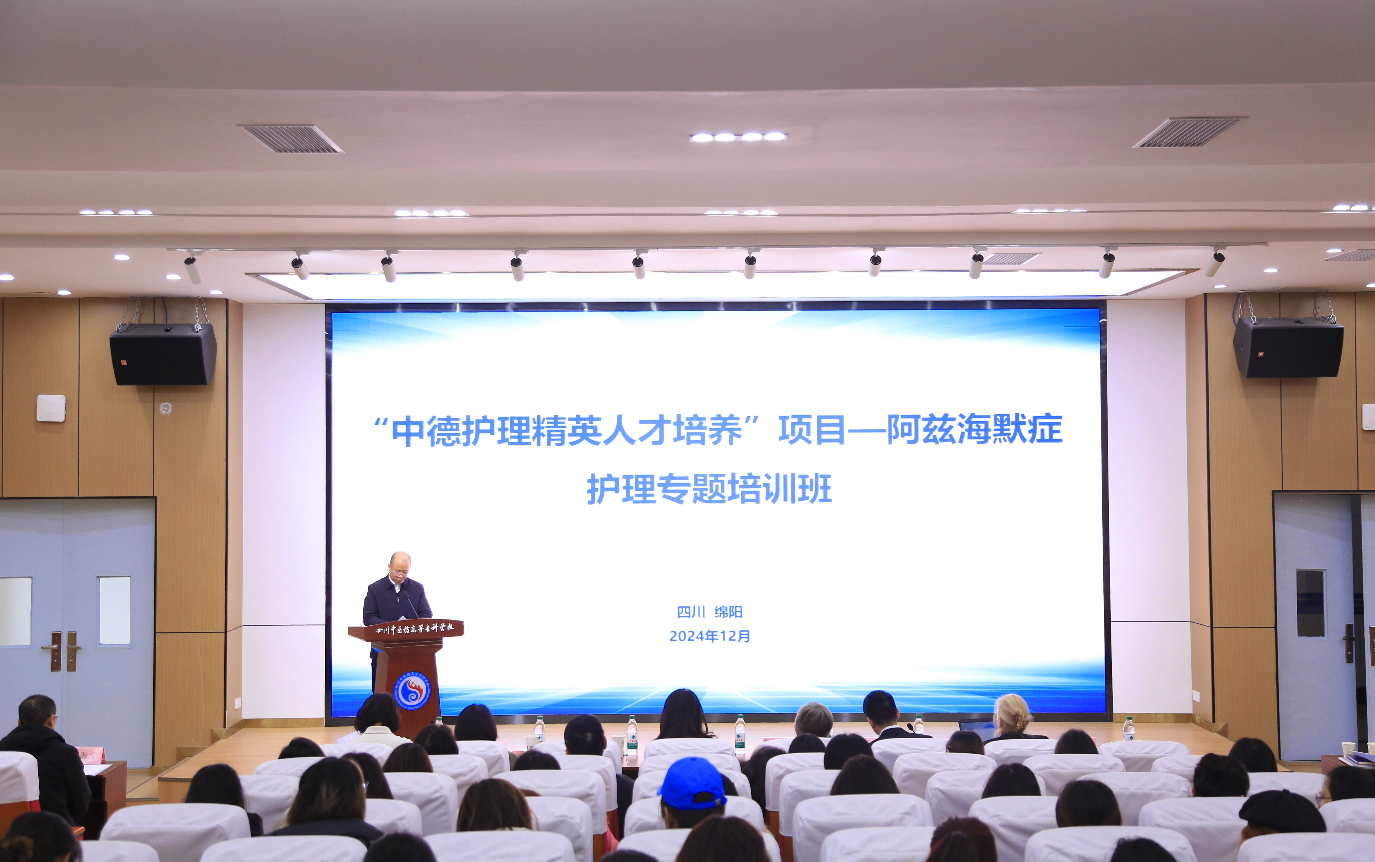 12月10日,“中德护理精英人才培养”项目—阿兹海默症护理专题培训班在我校举办。校长李祥、德国BBZ教育及科技中心中国区首席代表唐彬,绵阳市委外办副主任赵莉分别致辞,开班仪式由副校长肖玲主持。来自学校附属医院绵阳市中医医院、安州区人民医院以及相关合作医院的护理骨干及护理学院师生代表100余人线上线下参加开班仪式。