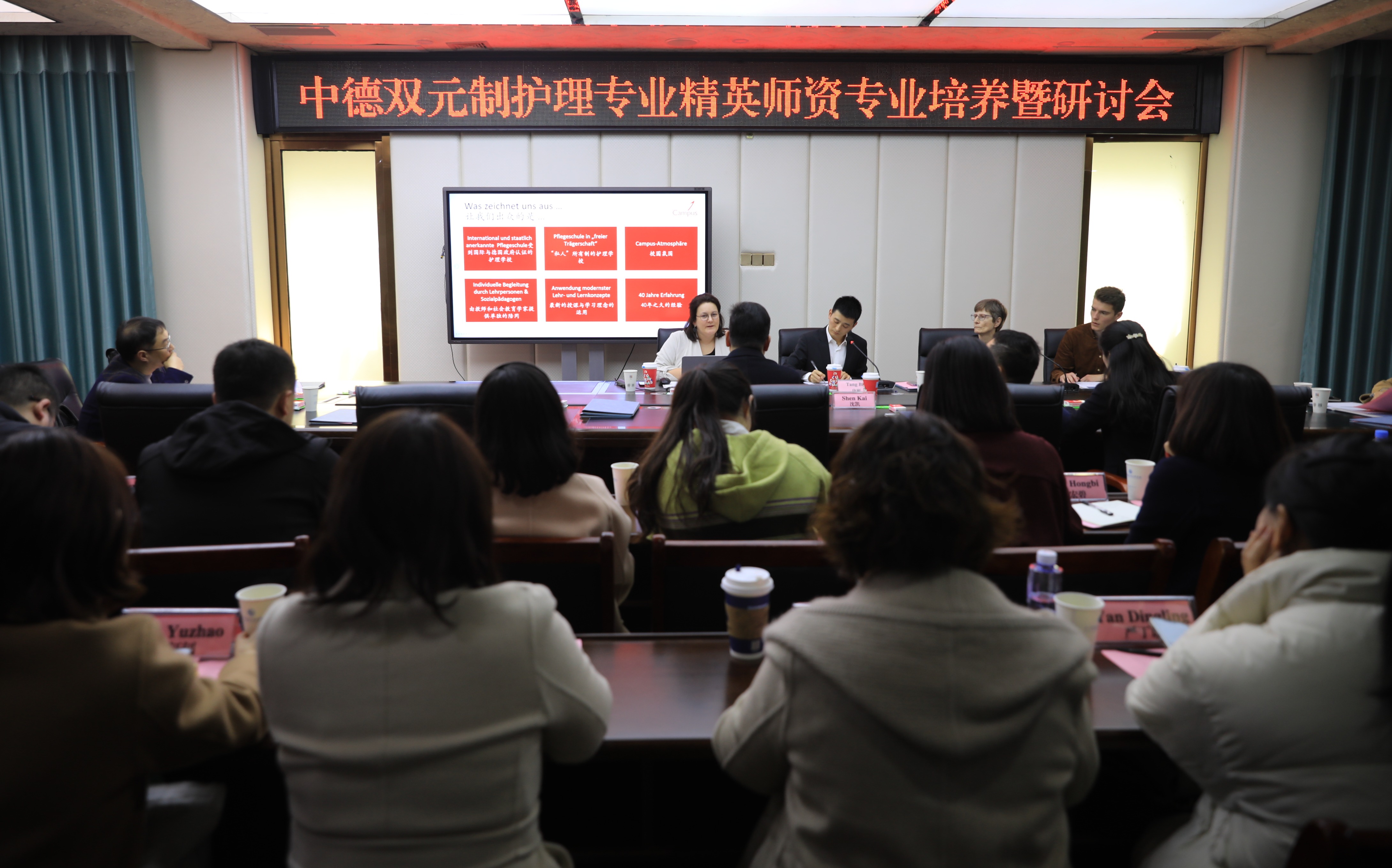 游瑟芬·郝若女士对德国双元制护理教育模式、教学理念、师资培养等方面进行了介绍,并就德国护士职业培训、职业发展、教学方法与理念、学生交流互访等方面进行与我校相关人员进行深入探讨。据悉,德国BBZ双元制护理学校隶属于德国领先的职业教育专业机构——德国BBZ MITTE教育及科技中心,该中心所有课程、管理及研发均通过DIN EN ISO 9001:2015质量认证,并提供包括职业教育的学历教育、专业技术人才赴德国就业、职业资格教育、在职培训、再就业培训、双元制本土化“德国国际班”等多元化的国际职业教育合作。
