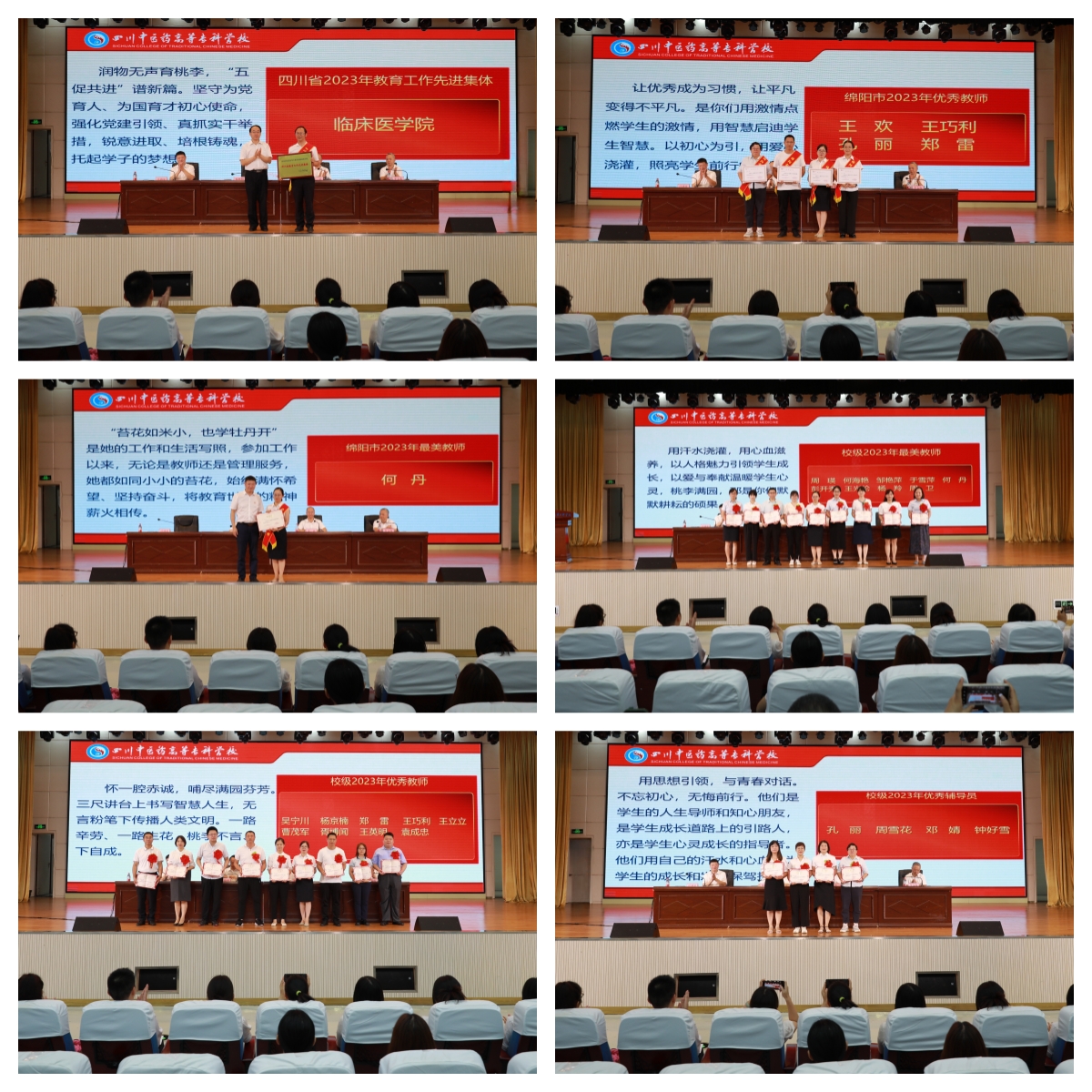 会议进行了退休教职工荣休仪式、新入职教师宣誓仪式;表彰了2023年校级师德标兵、校级最美教师、校级优秀教师、校级优秀辅导员、校级优秀最美教师团队;为获得2023年四川省教育工作先进集体、绵阳市优秀教师、绵阳市最美教师等荣誉称号的集体和个人颁发了荣誉证书。
