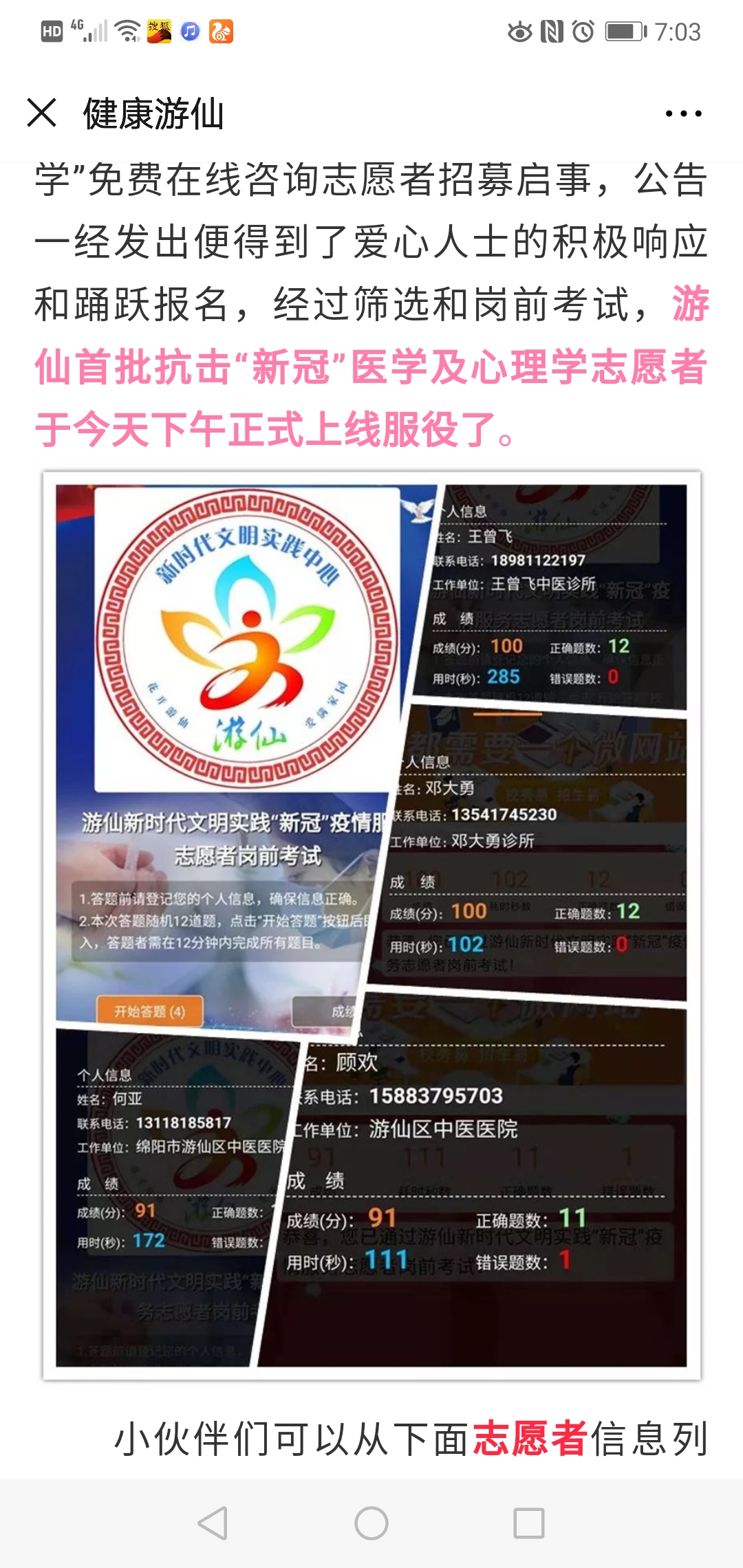 盟员邓大勇经过筛选和岗前考试成为游仙区首批抗击新冠肺炎医学及心理学志愿者并于2月6日正式上线服役,以缓解疫期常见病多发病看病难问题,做好个人防护和心理疏导,同时还承担了高速路口监测等志愿服务;盟员李远鹏、何仙童和杨静等坚持在中医门诊服务于广大群众,按市卫健委统一安排暂时停诊后,密切关注中医药在疫情防治中的动态,通过微信朋友圈等方式主动宣传,分享中医药临床应用的见解,帮助群众树立战胜疫情的信心、指导正确合理服用中药;盟员黄坤在科伦远程诊疗中心智慧药房开展就医咨询,降低老百姓进医院问诊感染的风险,为群众最基本的就医需求提供帮助;退休20多年仍坚持中医临床与教学的白习明老先生,也打算尽快调养好身体为抗击疫情而战,他的精神让大家备受鼓舞。
