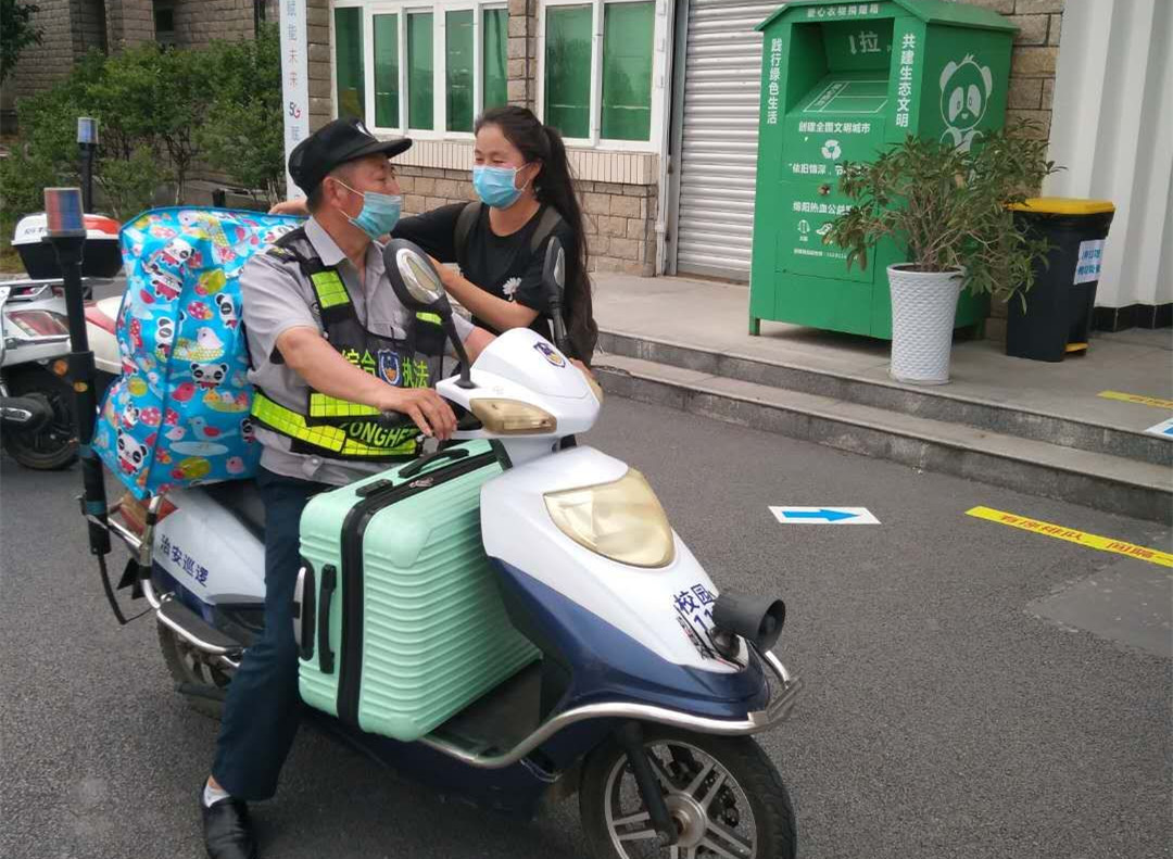 在报到现场,安保人员除了查验证件、治安管控、疏通交通外,还有组建了“校园骑行队”和“行李搬运队”为到校学生服务。每当有送学生车辆停靠时,安保人员组成的行李搬运队会主动帮学生把行李搬运下车,提醒学生带好证件、带齐物品,看到带大件行李的学生就立即通知骑行队做好准备;骑行队往返校门与宿舍之间,主要为带着大件行李和多件的行李学生服务。