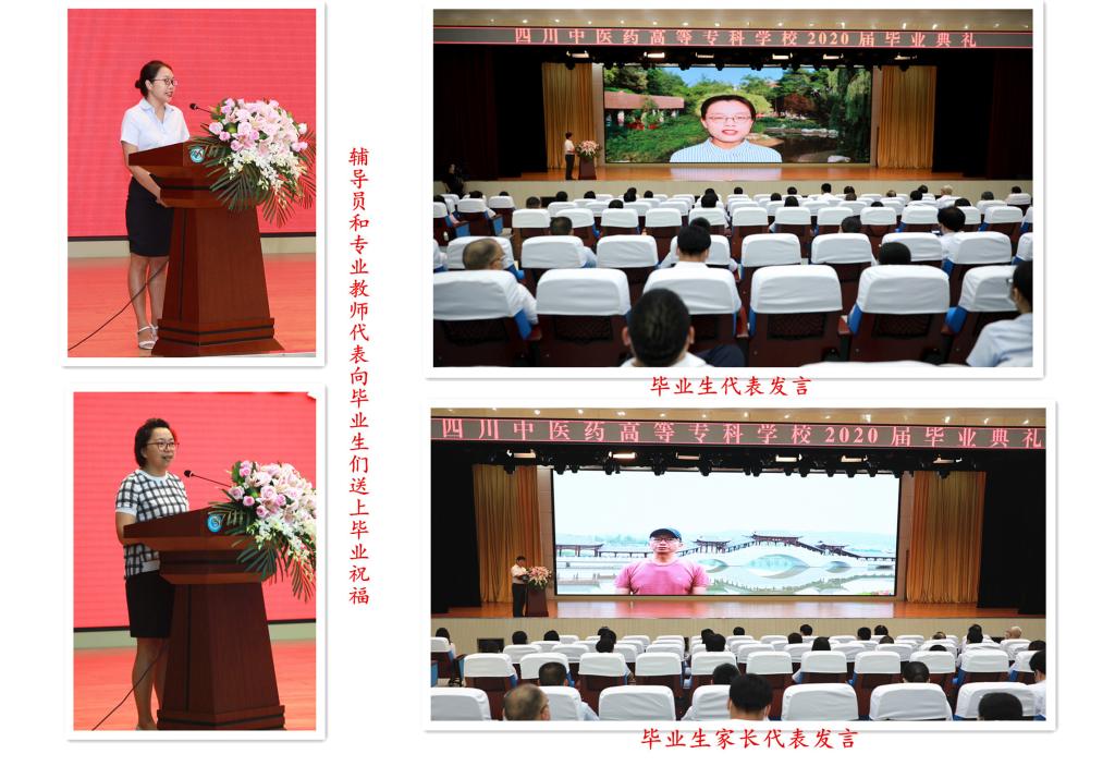 2017级医学检验专业学生吴莉莎和2017级中医学专业学生赵鑫坤家长赵顺,通过远程视频分别代表毕业生和毕业生家长发言,表达了对学校的感谢并对献身祖国医药卫生事业作出郑重承诺;针灸推拿学院辅导员龚绍臣和中医学院教师杨周赟分别作为辅导员和专业教师代表向毕业生们送上毕业祝福。
