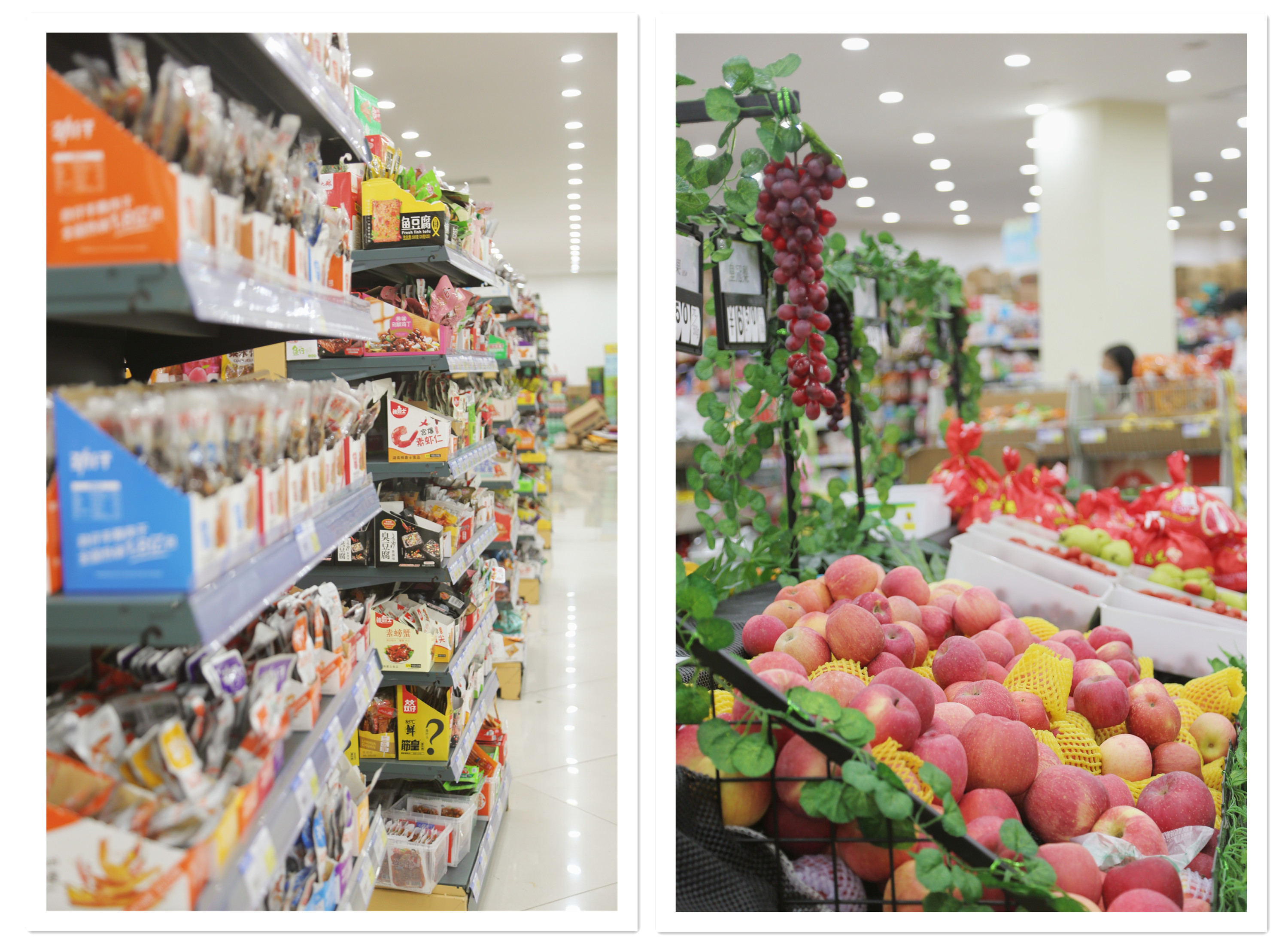 校园超市货架上的商品琳琅满目、种类繁多,学习生活用品、糕点水果零食应有尽有。