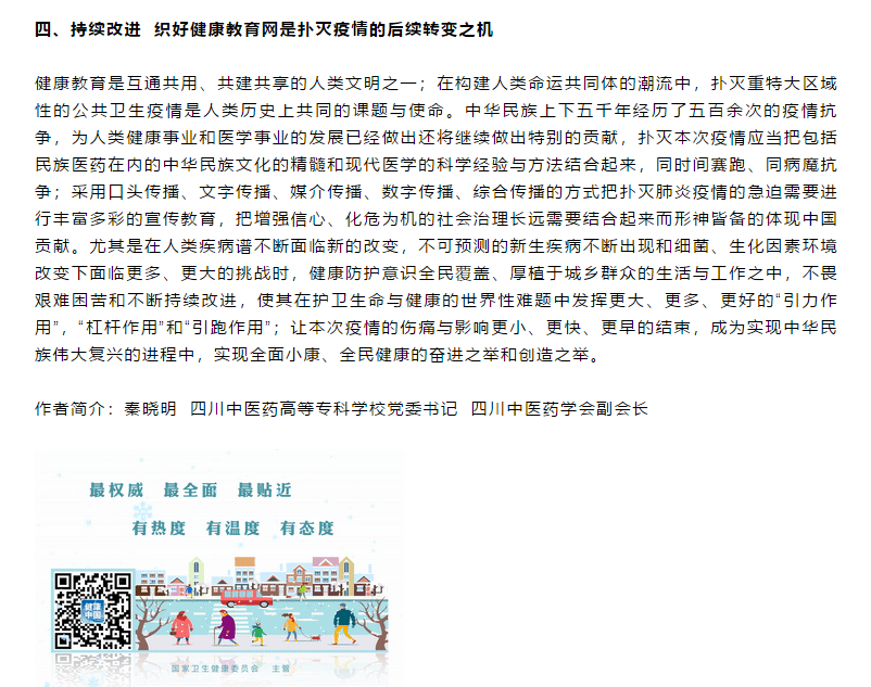 健康教育是通过有计划、有组织、有步骤、有目标的开展全社会健康促进活动,使城乡群众自觉运用科学与文明的行为与生活方式,以提高生活质量而少生疾病少生大病与重病。本次疫情的发生既有涉事方面认知的不足和认识的缺失,又有管控环节方法与措施的缺位;我国十四亿人口的健康防护任重道远,防控各类疫情弥漫式、井喷式的发生,最关键的步骤在于切断传播来源;阻断传播途径;保护易感人群;中医药的历代先贤留给后人最快最多最好的防控经验与措施集中体现于“上工不治已病治未病,不治已乱未乱。”健康教育与健康管理就是现实生活中最直接、最普遍、最快捷的“疫苗”;要充分发挥集中力量办大事的制度优势和各级党组织的战斗堡垒作用,分类、分区、分时、分段全面加快查找与弥补本次疫情处置中健康教育存在的短板及缺陷,既要对重点区域、重点人群、重点环节加快投入健康教育的力量与措施,又要对乡村社区、厂矿校园等基层组织加大健康教育的引导与覆盖。两千多年前中医就倡导了“正气存内,邪不可干”;“精神内守、病安从来”;这些朴素又极具丰富实践经验的学术思想与理论成果开启了人类健康教育的先河,为中华民族的繁衍昌盛和人类历史文明进步写下了辉煌篇章至今相沿袭用、不可替代。但由于多种因素,防控肺炎疫情发挥健康教育的作用还有多个层面、多个环节、多个时段的缺陷与差距;要采取政府主导、部门联动、专业支撑、群众参与、法制保障等工作机制的建立与完善,把健康教育纳入疫情防控的每一个区域、每一个岗位、每一个环节之中,既有生活化、大众化浅显易懂的灌输,又有科学性、针对性、实用性、操作性的宣讲,进而既能增强患者的信心又能激发大众战胜困难的勇气,用喜闻乐见的方式让不同年龄、不同性别、不同习俗的人群开口能讲、提笔能写、举手可为而吹糠见米;由此成为提高全民综合素养非常之时的非常之举,抢抓扑灭肺炎疫情的先行之机。