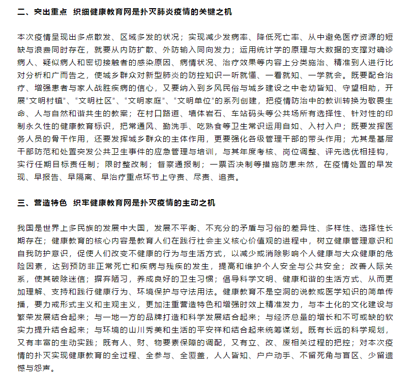 二、突出重点 织细健康教育网是扑灭肺炎疫情的关键之机