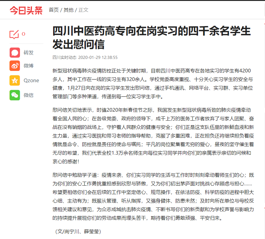 新型冠状病毒肺炎疫情防控正处于关键时期,目前四川中医药高专在各地实习的学生有4200多人,其中工作在一线的实习生有320余人。学校党委高度重视、十分关心实习学生的安全与健康,1月27日向在岗的实习学生发出慰问信,通过手机通讯、网络平台、实习群、实习单位管理部门等多种渠道,传递到每一位实习学生手中。