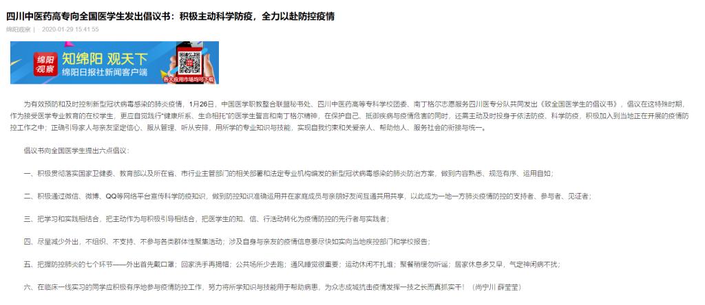 媒体报道 当前位置: 首页 >> 媒体报道 >> 正文 绵阳日报:四川中医药高专向全国医学生发出倡议书:积极主动科学防疫,全力以赴防控疫情 发布日期:2020-01-29 点击: 链接地址: 上一篇:中国教育在线:四川中医药高专向全国医学生发出倡议书:积极主动科学防疫 全力以赴防控疫情 下一篇:今日头条:四川中医药高专向在岗实习的四千余名学生发出慰问信