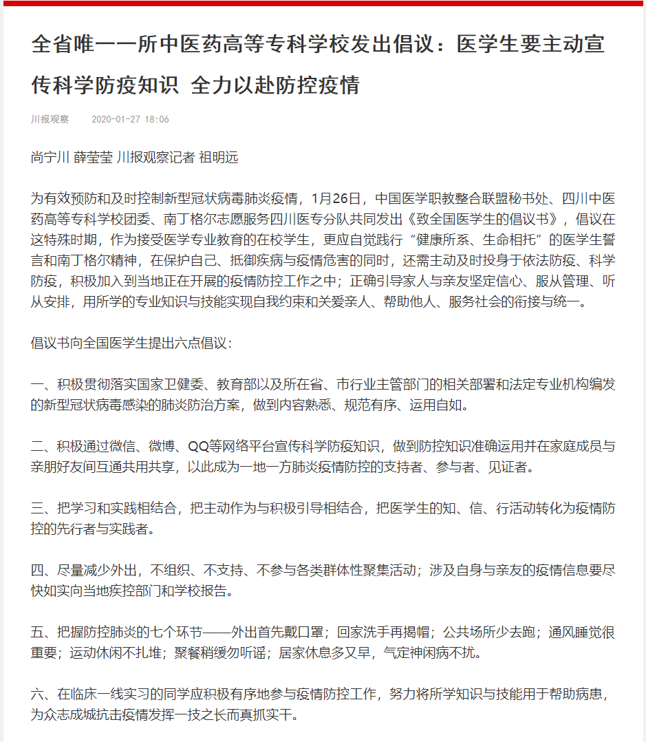 为有效预防和及时控制新型冠状病毒肺炎疫情,1月26日,中国医学职教整合联盟秘书处、四川中医药高等专科学校团委、南丁格尔志愿服务四川医专分队共同发出《致全国医学生的倡议书》,倡议在这特殊时期,作为接受医学专业教育的在校学生,更应自觉践行“健康所系、生命相托”的医学生誓言和南丁格尔精神,在保护自己、抵御疾病与疫情危害的同时,还需主动及时投身于依法防疫、科学防疫,积极加入到当地正在开展的疫情防控工作之中;正确引导家人与亲友坚定信心、服从管理、听从安排,用所学的专业知识与技能实现自我约束和关爱亲人、帮助他人、服务社会的衔接与统一。