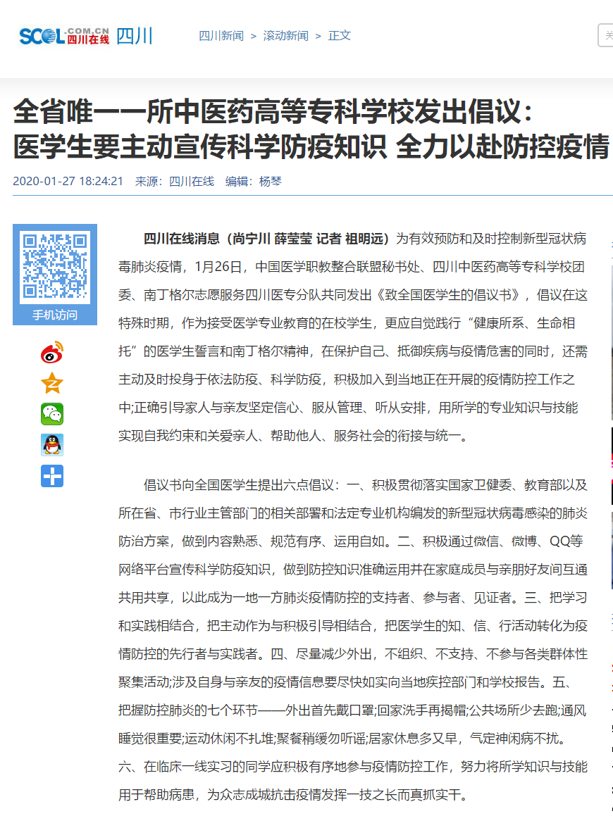 媒体报道 当前位置: 首页 >> 媒体报道 >> 正文 四川在线:全省唯一一所中医药高等专科学校发出倡议:医学生要主动宣传科学防疫知识 全力以赴防控疫情 发布日期:2020-01-27 点击: 链接地址:https://sichuan.scol.com.cn/ggxw/202001/57462850.html 上一篇:今日头条:四川中医药高专向全国医学生发出倡议书 下一篇:川报观察:全省唯一一所中医药高等专科学校发出倡议:医学生要主动宣传科学防疫知识 全力以赴防控疫情