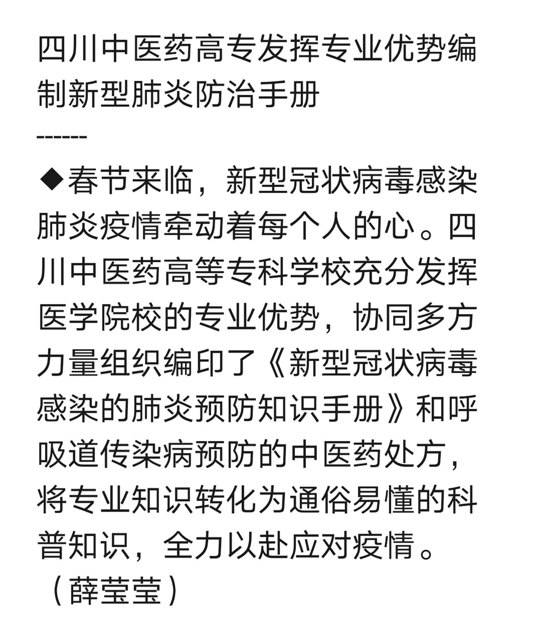 媒体报道 当前位置: 首页 >> 媒体报道 >> 正文 手机报:四川中医药高专发挥专业优势,编制新型肺炎防治手册 发布日期:2020-01-24 点击: 上一篇:今日头条:四川中医药高专:编印新型肺炎防治手册 发挥专业优势助健康献爱心 下一篇:今日头条:四川中医药高专向全国医学生发出倡议书