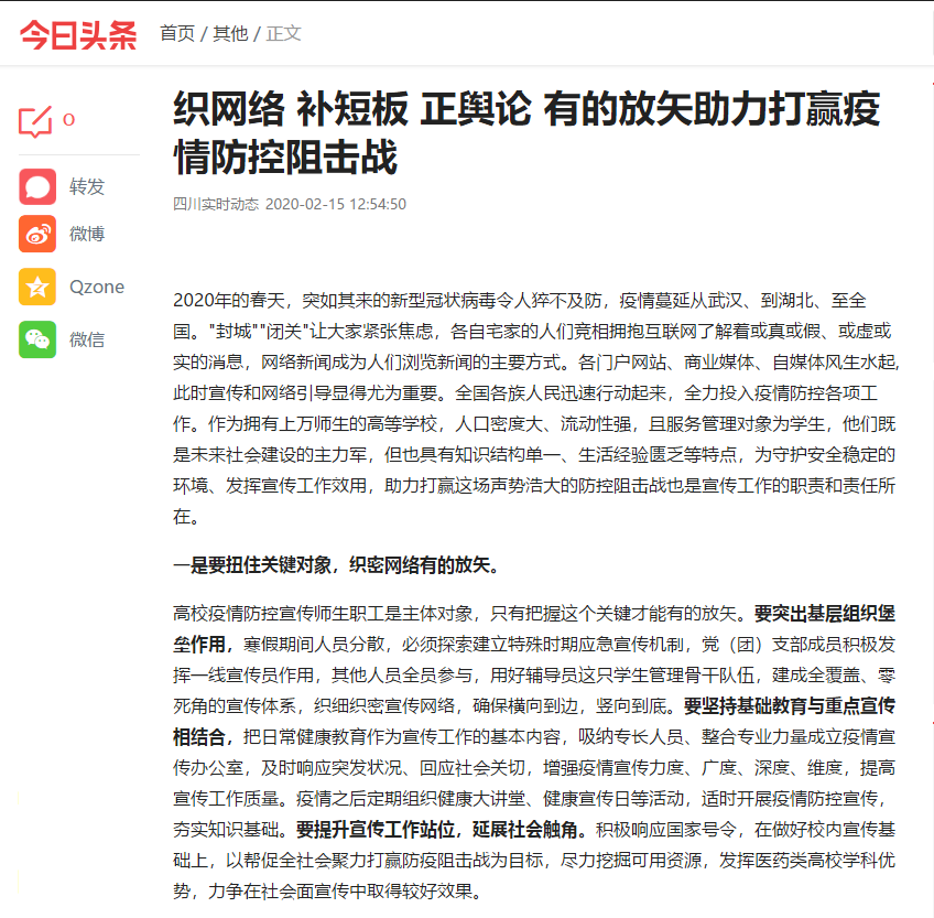 媒体报道 当前位置: 首页 >> 媒体报道 >> 正文 今日头条:织网络 补短板 正舆论 有的放矢助力打赢疫情防控阻击战 发布日期:2020-02-15 点击: 链接地址:https://www.toutiao.com/i6793532268263506446/ 上一篇:四川党建之声:四川中医药高专全力打好疫期心理保卫战 下一篇:四川在线:织网络 补短板 正舆论 有的放矢助力打赢疫情防控阻击战