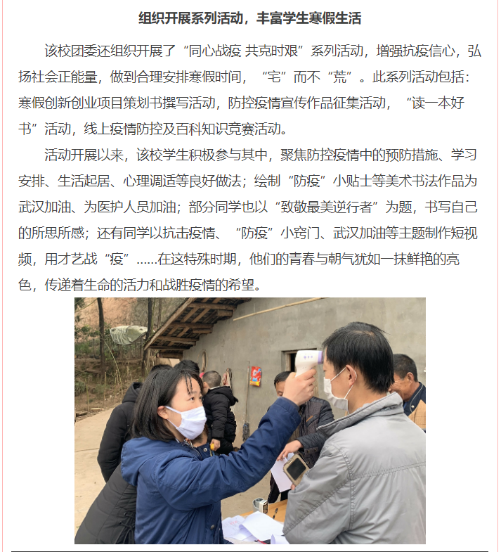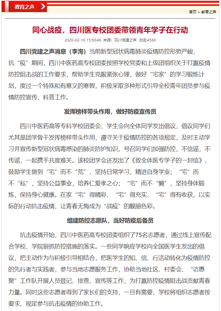 媒体报道 当前位置: 首页 >> 媒体报道 >> 正文 四川党建之声:同心战疫,四川医专校团委带领青年学子在行动 发布日期:2020-02-16 点击: 链接地址: 上一篇:今日头条:同心战“疫”,四川中医药高专校团委带领青年学子在行动 下一篇:今日头条:抗击疫情 停课不停学 四川中医药高专创新创业"战疫"讲堂开讲