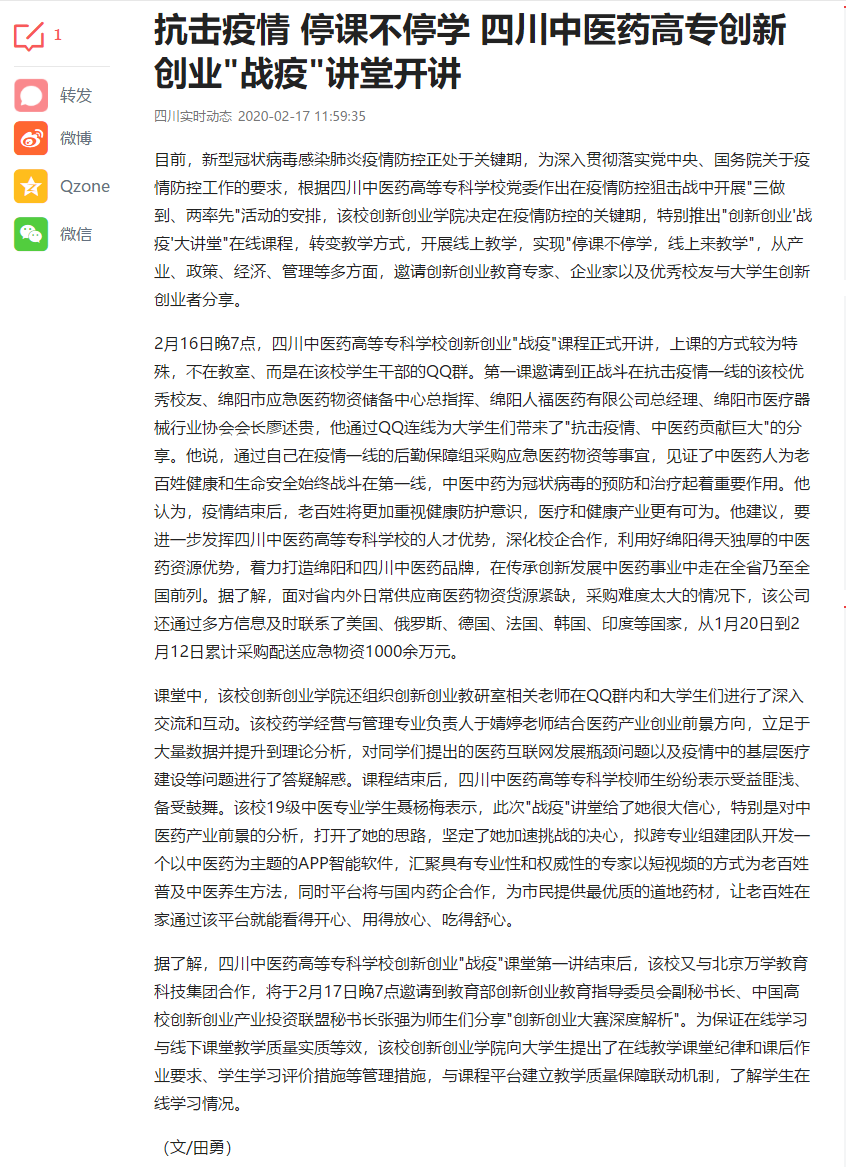 媒体报道 当前位置: 首页 >> 媒体报道 >> 正文 今日头条:抗击疫情 停课不停学 四川中医药高专创新创业"战疫"讲堂开讲 发布日期:2020-02-17 点击: 链接地址:https://www.toutiao.com/i6794260198023234051 上一篇:四川党建之声:同心战疫,四川医专校团委带领青年学子在行动 下一篇:川报观察:应急医药物资储备中心总指挥分享实战经验,这所学校的“网课”很有料