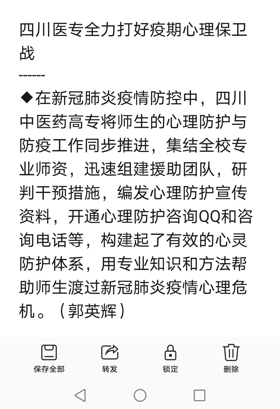媒体报道 当前位置: 首页 >> 媒体报道 >> 正文 绵阳手机报:四川医专全力打好疫期心理保卫战 发布日期:2020-02-16 点击: 上一篇:四川在线:织网络 补短板 正舆论 有的放矢助力打赢疫情防控阻击战 下一篇:同心战疫,校团委带领青年学子在行动