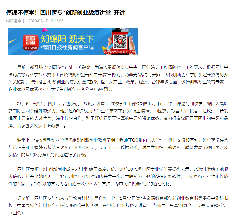 媒体报道 当前位置: 首页 >> 媒体报道 >> 正文 绵阳观察:停课不停学!四川医专“创新创业战疫讲堂”开讲 发布日期:2020-02-17 点击: 链接地址: 上一篇:四川省中医药管理局:战“疫”进行时|樊樊,52床的雷婆婆说等你回来请你吃火锅! 下一篇:四川党建之声:抗击疫情 停课不停学 四川中医药高专创新创业“战疫”讲堂开讲