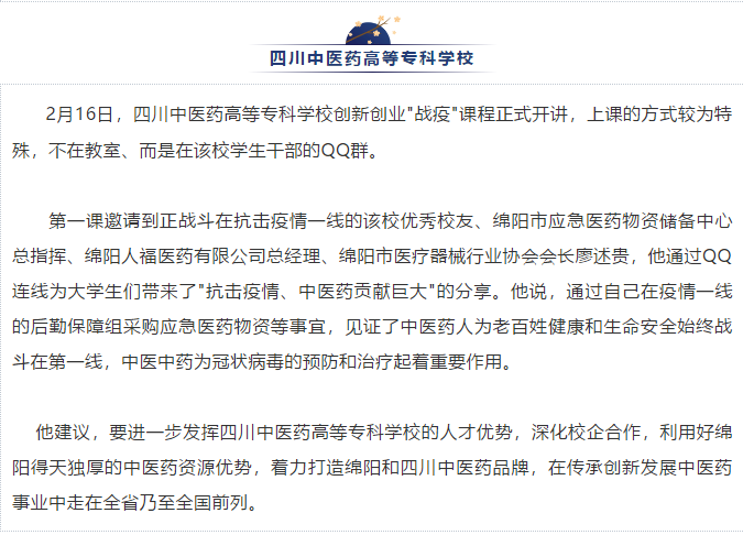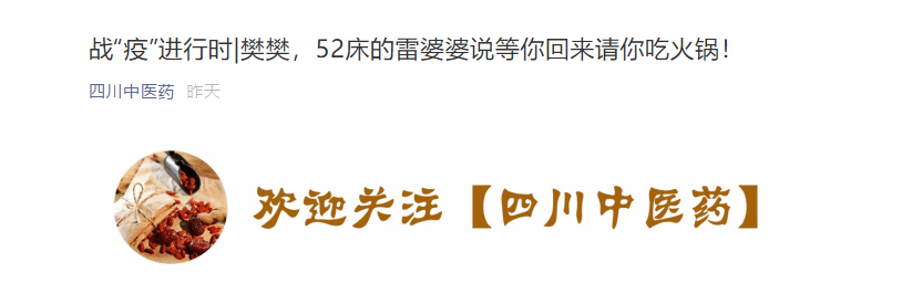 媒体报道 当前位置: 首页 >> 媒体报道 >> 正文 四川省中医药管理局:战“疫”进行时|樊樊,52床的雷婆婆说等你回来请你吃火锅! 发布日期:2020-02-17 点击: 链接地址:https://mp.weixin.qq.com/s/kYfABvvQCj0JP14BPC4w_g 上一篇:川报观察:应急医药物资储备中心总指挥分享实战经验,这所学校的“网课”很有料 下一篇:绵阳观察:停课不停学!四川医专“创新创业战疫讲堂”开讲
