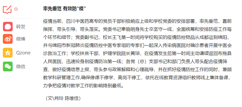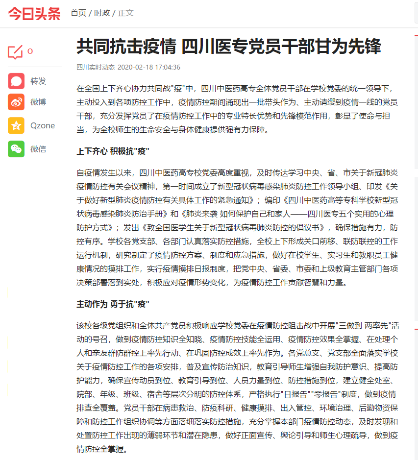 媒体报道 当前位置: 首页 >> 媒体报道 >> 正文 今日头条:共同抗击疫情 四川医专党员干部甘为先锋 发布日期:2020-02-18 点击: 链接地址:https://www.toutiao.com/i6794709885457007116/?tt_from=weixin&utm_campaign=client_share&wxshare_count=1×tamp=1582019175&app=news_article&utm_source=weixin&utm_medium=toutiao_android&req_id=2020021817461501002607719901BC96D2&group_id=6794709885457007116 上一篇:现代职业教育网:职教战“疫” |战“疫”时期履职尽责当好“班妈”“班爸” 下一篇:现代职业教育网:职教战“疫” |共同抗击疫情 四川医专党员干部甘为先锋