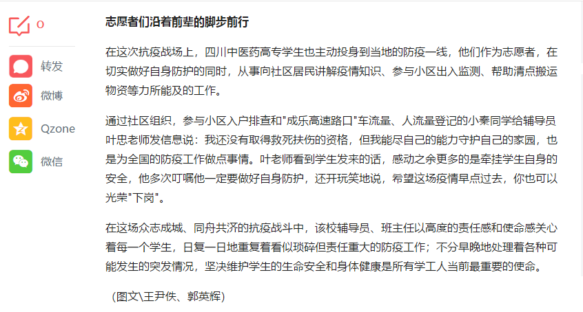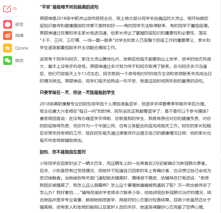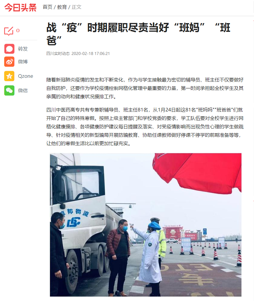 媒体报道 当前位置: 首页 >> 媒体报道 >> 正文 今日头条:战“疫”时期履职尽责当好“班妈”“班爸” 发布日期:2020-02-18 点击: 链接地址:https://www.toutiao.com/i6794710338433450508/?tt_from=weixin&utm_campaign=client_share&wxshare_count=1×tamp=1582019197&app=news_article&utm_source=weixin&utm_medium=toutiao_android&req_id=2020021817463701002607708533C0A752&group_id=6794710338433450508 上一篇:四川党建之声:停课不停学 四川中医药高专创新创业“战疫”讲堂再出硬招 下一篇:四川在线:停课不停学 四川中医药高专创新创业“战疫”讲堂再出硬招