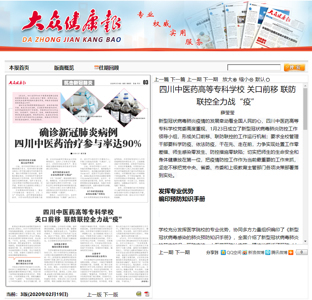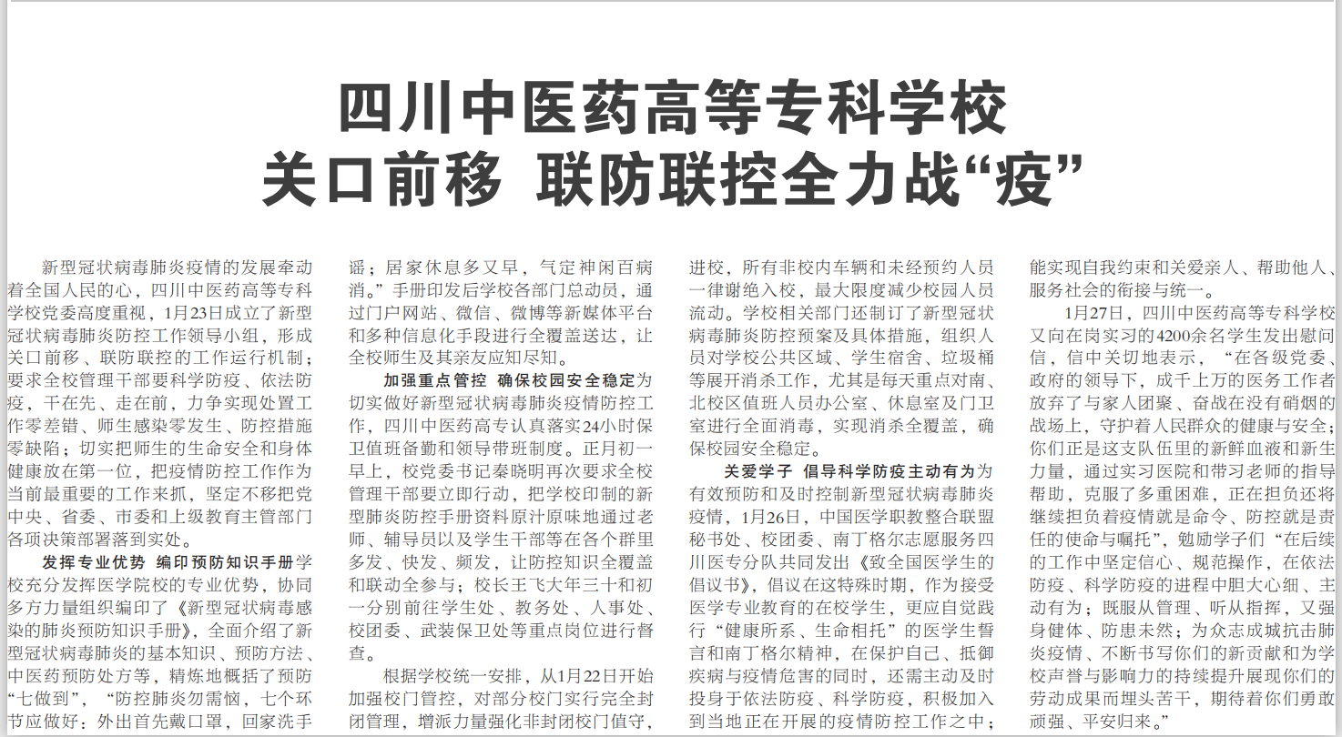 媒体报道 当前位置: 首页 >> 媒体报道 >> 正文 大众健康报:四川中医药高等专科学校关口前移联防联控全力战“疫” 发布日期:2020-02-19 点击: 链接地址:http://dzjk.zkbctech.com/article/1424/1578.html 上一篇:四川党建之声:共同抗击疫情 四川医专党员干部甘为先锋 下一篇:中国教育在线:四川中医药高等专科学校发挥医学院校专业特色 助力打赢“脱贫+防疫”双战役
