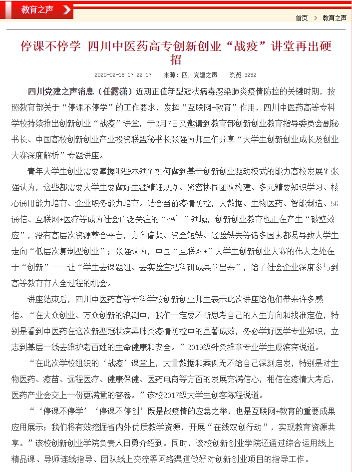 媒体报道 当前位置: 首页 >> 媒体报道 >> 正文 四川党建之声:停课不停学 四川中医药高专创新创业“战疫”讲堂再出硬招 发布日期:2020-02-18 点击: 上一篇:现代职业教育网:职教战“疫” |共同抗击疫情 四川医专党员干部甘为先锋 下一篇:今日头条:战“疫”时期履职尽责当好“班妈”“班爸”
