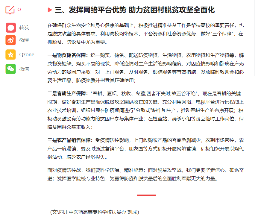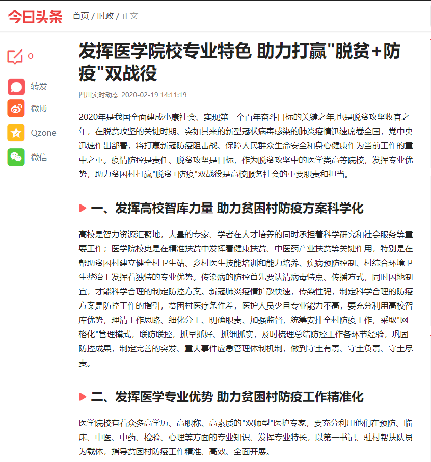 媒体报道 当前位置: 首页 >> 媒体报道 >> 正文 今日头条:发挥医学院校专业特色 助力打赢"脱贫+防疫"双战役 发布日期:2020-02-19 点击: 链接地址:https://www.toutiao.com/i6795035815207502348/?tt_from=weixin&utm_campaign=client_share&wxshare_count=1&from=groupmessage×tamp=1582103677&app=news_article&utm_source=weixin&utm_medium=toutiao_android&req_id=202002191714370101450260220D0B52B9&group_id=6795035815207502348 上一篇:中国教育在线:四川中医药高等专科学校发挥医学院校专业特色 助力打赢“脱贫+防疫”双战役 下一篇:四川党建之声:发挥医学院校专业特色 助力打赢“脱贫+防疫”双战役