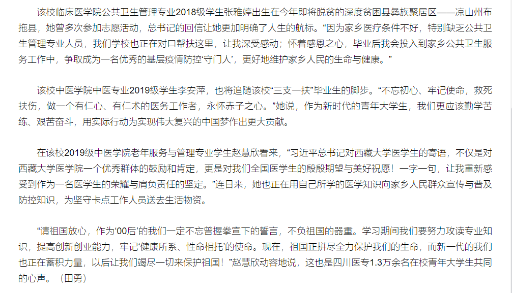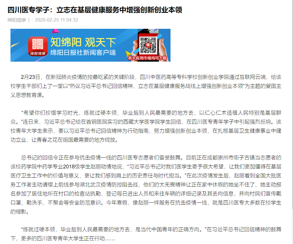 媒体报道 当前位置: 首页 >> 媒体报道 >> 正文 绵阳观察:四川医专学子:立志在基层健康服务中增强创新创业本领 发布日期:2020-02-25 点击: 链接地址: 上一篇:四川在线:四川医专学子学习习近平总书记回信精神 立志在基层健康服务中增强创新创业本领 下一篇:现代职业教育网:职教战“疫” |四川中医药高专学子:学习贯彻习近平总书记回信精神 立志在基层健康服务岗位上实践成才