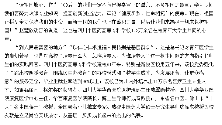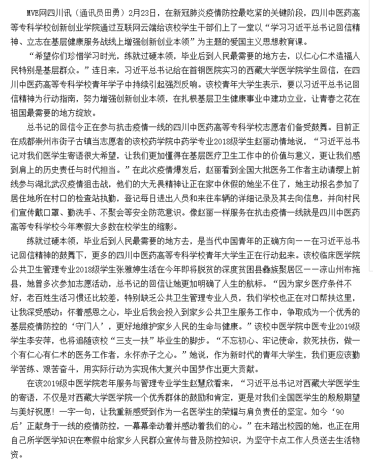 媒体报道 当前位置: 首页 >> 媒体报道 >> 正文 现代职业教育网:职教战“疫” |四川中医药高专学子:学习贯彻习近平总书记回信精神 立志在基层健康服务岗位上实践成才 发布日期:2020-02-25 点击: 链接地址:http://www.mve.cn/html/2020/yxdt_0225/43757.html#10006-weixin-1-52626-6b3bffd01fdde4900130bc5a2751b6d1 上一篇:绵阳观察:四川医专学子:立志在基层健康服务中增强创新创业本领 下一篇:现代职教网:职教战“疫” |开学延期学习不延期 四川中医药高专在线课程全面开课