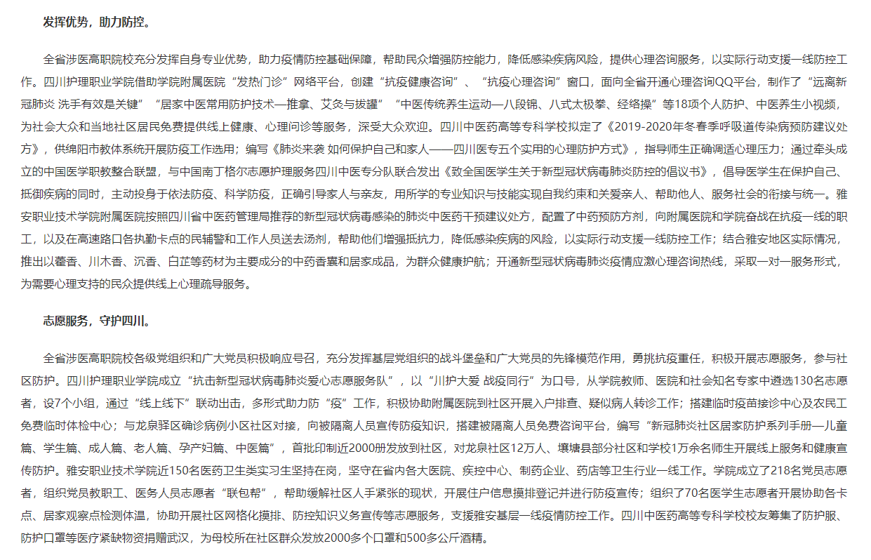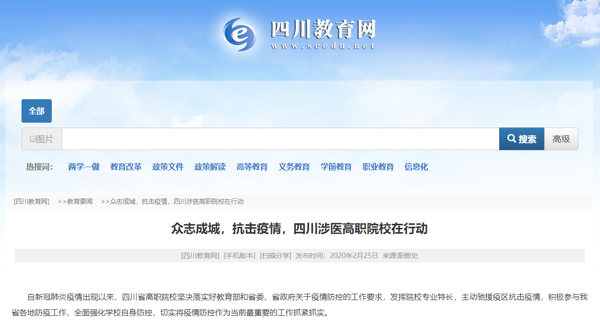 媒体报道 当前位置: 首页 >> 媒体报道 >> 正文 四川教育网:众志成城,抗击疫情,四川涉医高职院校在行动 发布日期:2020-02-25 点击: 链接地址: 上一篇:现代职教网:职教战“疫” |开学延期学习不延期 四川中医药高专在线课程全面开课 下一篇:共产党员网:“四织”健康教育网 捕捉扑灭肺炎疫情战机