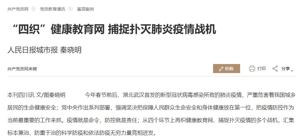 媒体报道 当前位置: 首页 >> 媒体报道 >> 正文 共产党员网:“四织”健康教育网 捕捉扑灭肺炎疫情战机 发布日期:2020-02-26 点击: 本文被《中国财经早报》、网易新闻、热搜头条等40多家媒体、网站刊载。 链接地址:http://tougao.12371.cn/gaojian.php?tid=3139799 上一篇:四川教育网:众志成城,抗击疫情,四川涉医高职院校在行动 下一篇:四川省教育厅:开学延期学习不延期 四川中医药高专在线课程全面开课