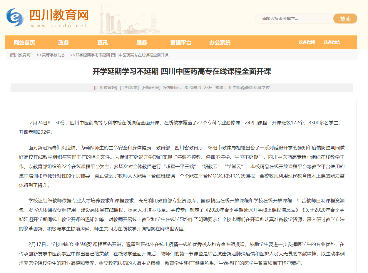 媒体报道 当前位置: 首页 >> 媒体报道 >> 正文 四川省教育厅:开学延期学习不延期 四川中医药高专在线课程全面开课 发布日期:2020-02-28 点击: 链接地址: 上一篇:共产党员网:“四织”健康教育网 捕捉扑灭肺炎疫情战机 下一篇:四川党建之声:四川中医药高专:战“疫”时期履职尽责当好“班妈”“班爸”