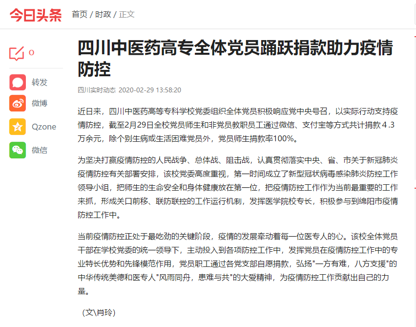 媒体报道 当前位置: 首页 >> 媒体报道 >> 正文 今日头条:四川中医药高专全体党员踊跃捐款助力疫情防控 发布日期:2020-02-29 点击: 链接地址:https://www.toutiao.com/i6798743821757710855/?tt_from=weixin&utm_campaign=client_share&wxshare_count=1×tamp=1582956597&app=news_article&utm_source=weixin&utm_medium=toutiao_android&req_id=202002291409560100260760230ABED1BE&group_id=6798743821757710855 上一篇:中国教育在线:四川中医药高专:结合伟大的抗疫精神抓牢大学生的思政教育 下一篇:川报观察:绵阳大学生创客自制1000根艾条送抗疫一线