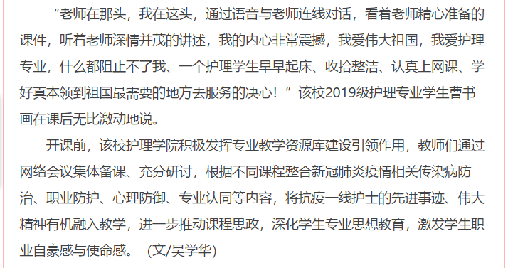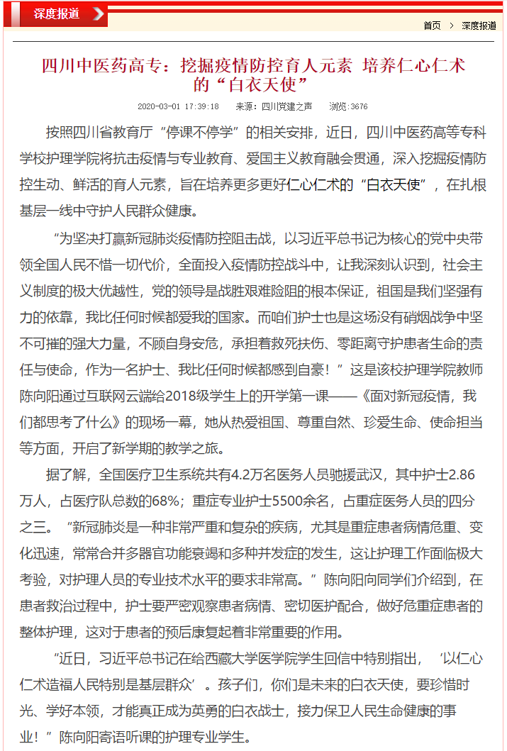 媒体报道 当前位置: 首页 >> 媒体报道 >> 正文 四川党建之声:四川中医药高专:挖掘疫情防控育人元素 培养仁心仁术的“白衣天使” 发布日期:2020-03-01 点击: 链接地址: 上一篇:绵阳观察:四川中医药高专学生自治中药“小武器”送抗疫一线 下一篇:今日头条:四川中医药高专:挖掘疫情防控育人元素 培养仁心仁术的"白衣天使"