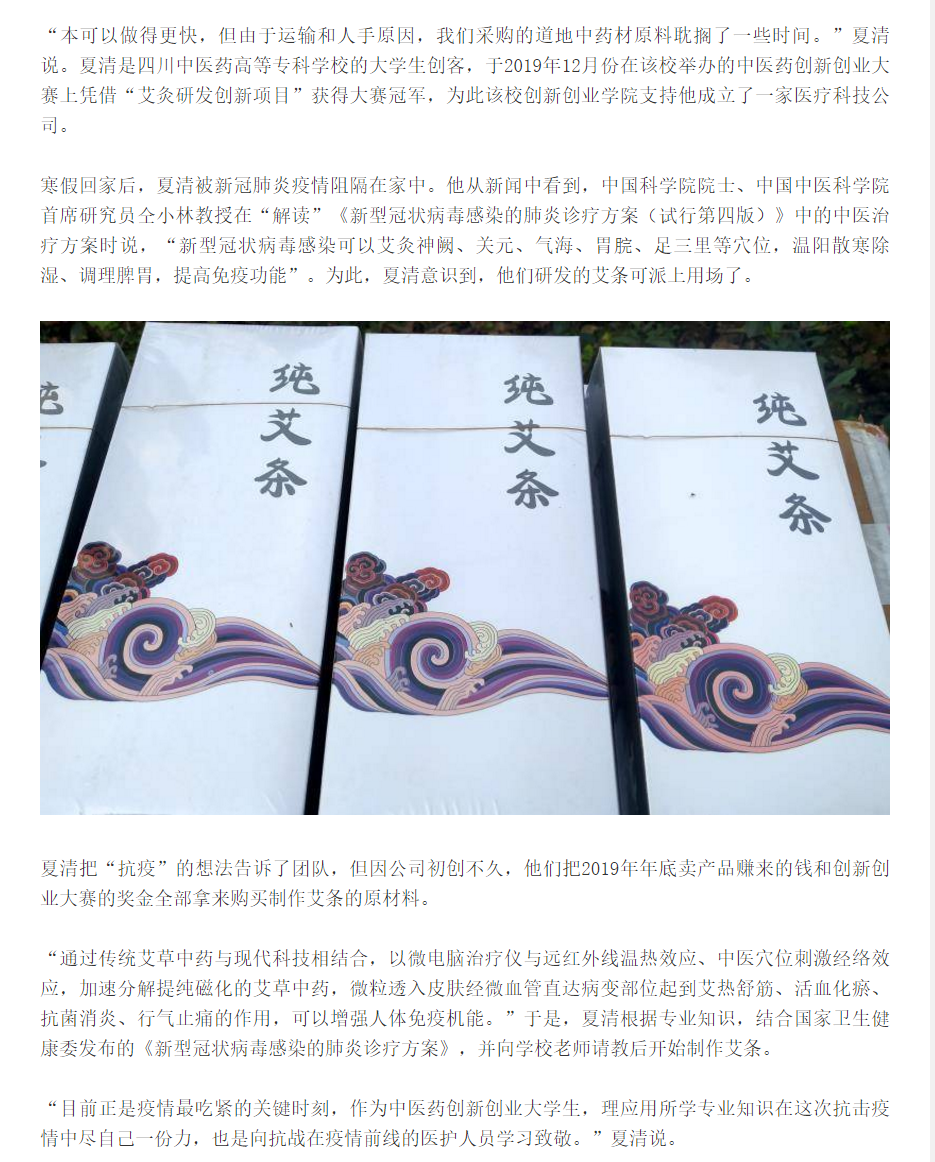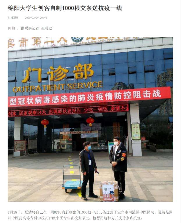 媒体报道 当前位置: 首页 >> 媒体报道 >> 正文 川报观察:绵阳大学生创客自制1000根艾条送抗疫一线 发布日期:2020-02-29 点击: 链接地址:https://cbgc.scol.com.cn/news/246470?from=singlemessage 上一篇:今日头条:四川中医药高专全体党员踊跃捐款助力疫情防控 下一篇:四川在线:绵阳大学生创客自制1000根艾条送抗疫一线