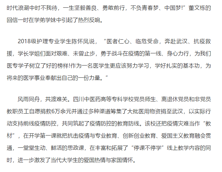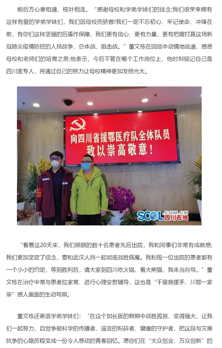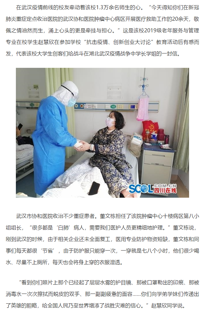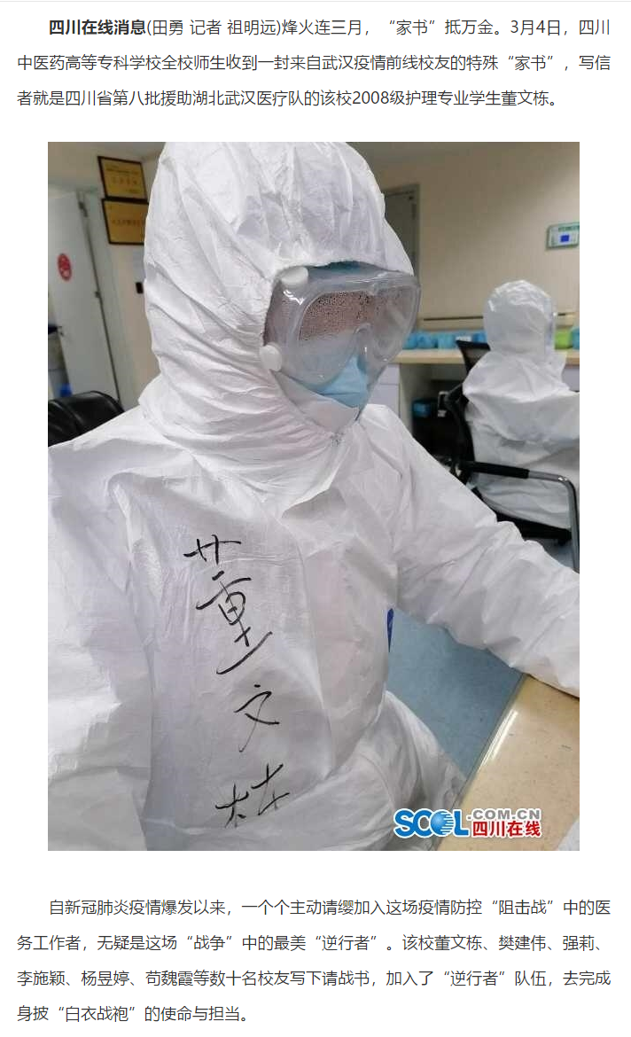 媒体报道 当前位置: 首页 >> 媒体报道 >> 正文 四川在线:学长鼓舞后辈 绵阳高校收到一封来自武汉疫情前线的特殊“家书” 发布日期:2020-03-05 点击: 链接地址:https://mianyang.scol.com.cn/jy2/202003/57502637.html?from=groupmessage&isappinstalled=0 上一篇:中国小康新闻网、中国新闻信息网等5家媒体刊载:四川中医药大学生自制中药“小武器”送抗疫一线 下一篇:四川党建之声:四川中医药高专:结合护理校友抗疫事迹 弘扬传承南丁格尔精神