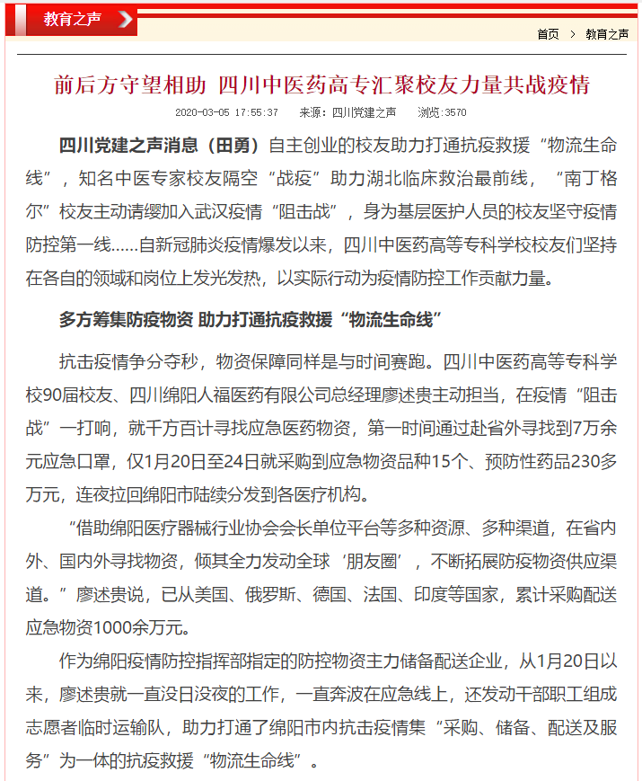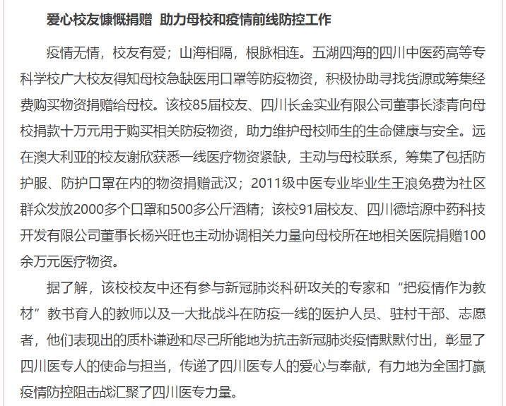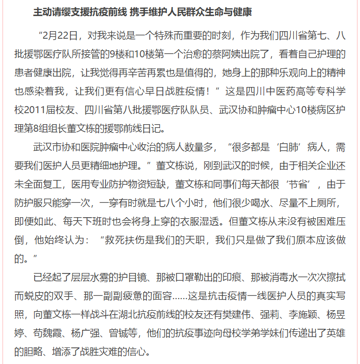 媒体报道 当前位置: 首页 >> 媒体报道 >> 正文 四川党建之声:前后方守望相助 四川中医药高专汇聚校友力量共战疫情 发布日期:2020-03-05 点击: 链接地址: 上一篇:四川党建之声:四川中医药高专:结合护理校友抗疫事迹 弘扬传承南丁格尔精神 下一篇:学习强国:【温暖】非常时刻,那些最走心的凡人金句(三十)