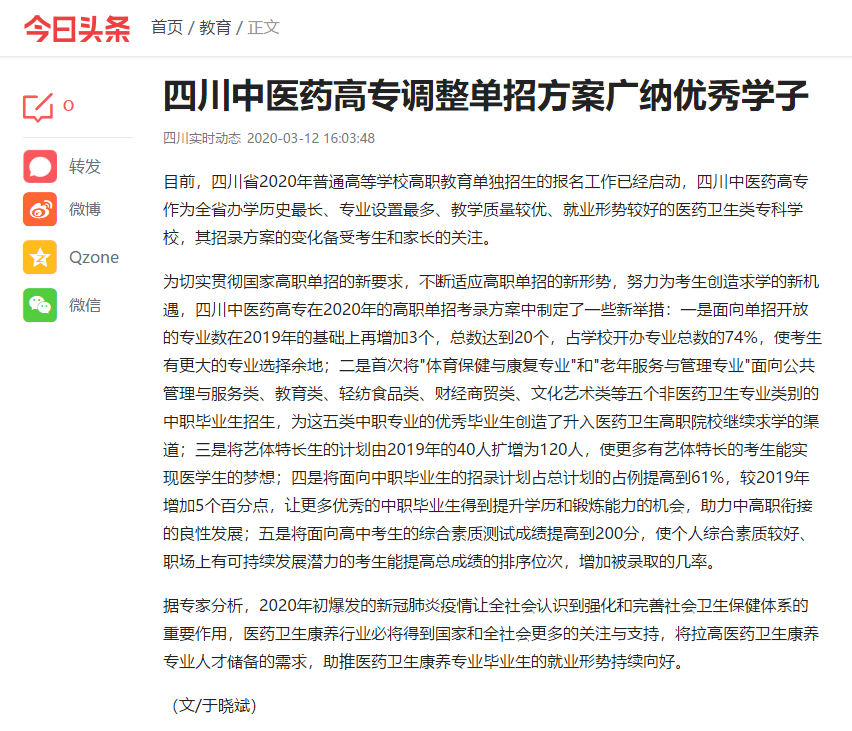 媒体报道 当前位置: 首页 >> 媒体报道 >> 正文 今日头条:四川中医药高专调整单招方案广纳优秀学子 发布日期:2020-03-12 点击: 链接地址:https://www.toutiao.com/i6803229176162681351/?tt_from=weixin&utm_campaign=client_share&wxshare_count=1×tamp=1584000788&app=news_article&utm_source=weixin&utm_medium=toutiao_android&req_id=202003121613070100200470143310C8E5&group_id=6803229176162681351 上一篇:今日头条:四川中医药高专在疫情大考中展现担当作为 下一篇:现代职业教育网:四川中医药高专新增单招举措为考生创造更多机会