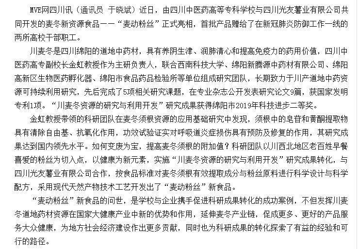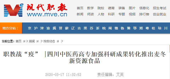 媒体报道 当前位置: 首页 >> 媒体报道 >> 正文 现代职业教育网:四川中医药高专加强科研成果转化推出麦冬新资源食品 发布日期:2020-03-17 点击: 链接地址:http://www.mve.cn/html/2020/yxdt_0317/44401.html 上一篇:中国教育在线:四川中医药高等专科学校:研发健康新食品助推科研成果的转化 下一篇:现代职业教育网:四川中医药高等专科学校:讲话精神激人心 攻坚克难战脱贫
