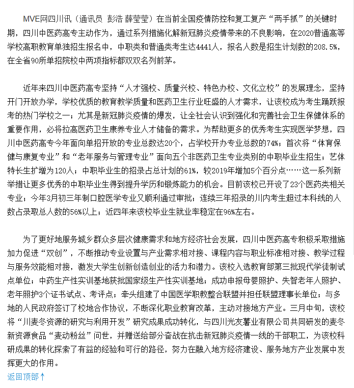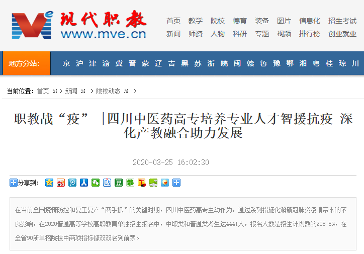 媒体报道 当前位置: 首页 >> 媒体报道 >> 正文 现代职业教育网:四川中医药高专培养专业人才智援抗疫 深化产教融合助力发展 发布日期:2020-03-25 点击: 链接地址:http://www.mve.cn/html/2020/yxdt_0325/44593.html#10006-weixin-1-52626-6b3bffd01fdde4900130bc5a2751b6d1 上一篇:四川党建之声:四川中医药高等专科学校:讲话精神激人心 攻坚克难战脱贫 下一篇:今日头条:四川中医药高专与绵阳市游仙区共建创新创业培训基地