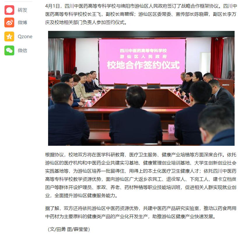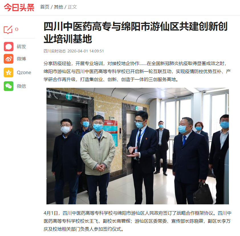媒体报道 当前位置: 首页 >> 媒体报道 >> 正文 今日头条:四川中医药高专与绵阳市游仙区共建创新创业培训基地 发布日期:2020-04-01 点击: 链接地址:https://www.toutiao.com/i6810621516061868552 上一篇:现代职业教育网:四川中医药高专培养专业人才智援抗疫 深化产教融合助力发展 下一篇:四川在线:绵阳高校与游仙区共建创新创业平台 培养本土化卫生健康人才