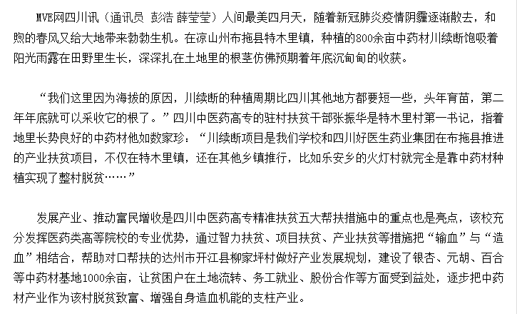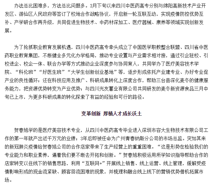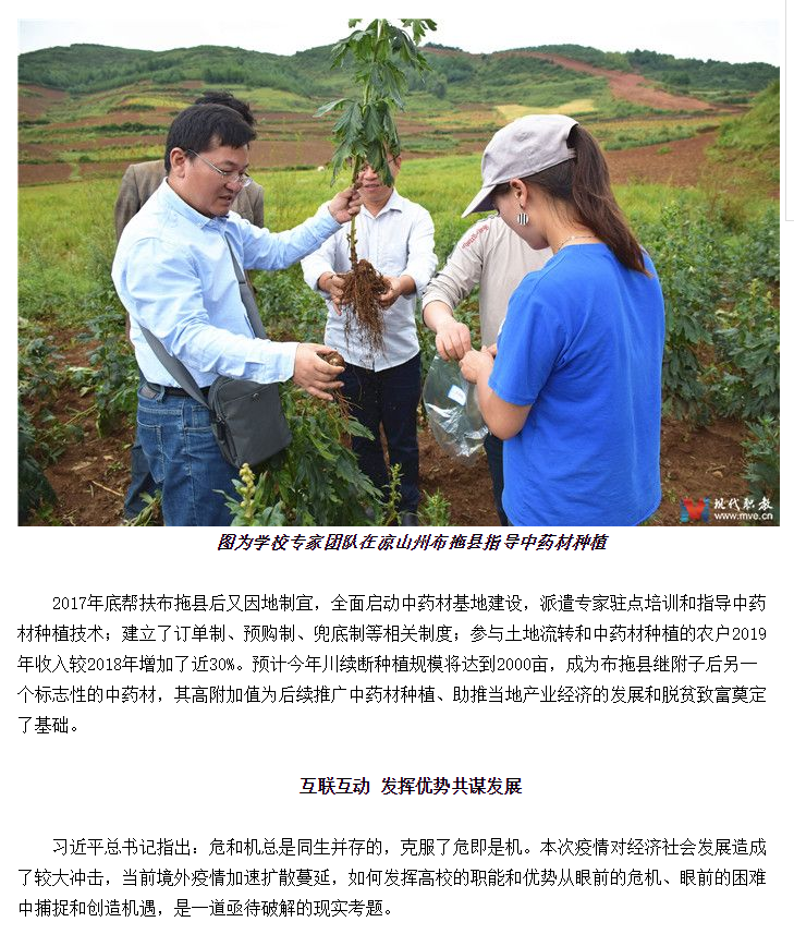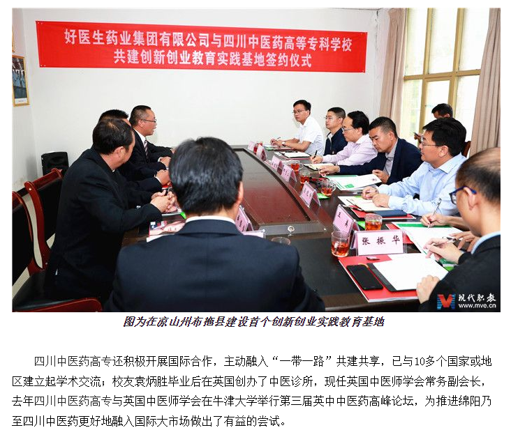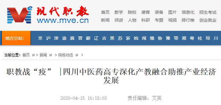 媒体报道 当前位置: 首页 >> 媒体报道 >> 正文 现代职业教育网:四川中医药高专深化产教融合助推产业经济发展 发布日期:2020-04-15 点击: 链接地址:http://www.mve.cn/html/2020/yxdt_0415/44963.html#10006-weixin-1-52626-6b3bffd01fdde4900130bc5a2751b6d1 上一篇:四川在线:绵阳高校与游仙区共建创新创业平台 培养本土化卫生健康人才 下一篇:川报观察:护士节快到了,他们这样点亮薪火