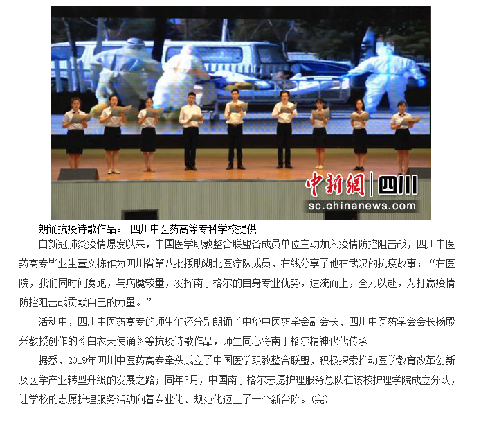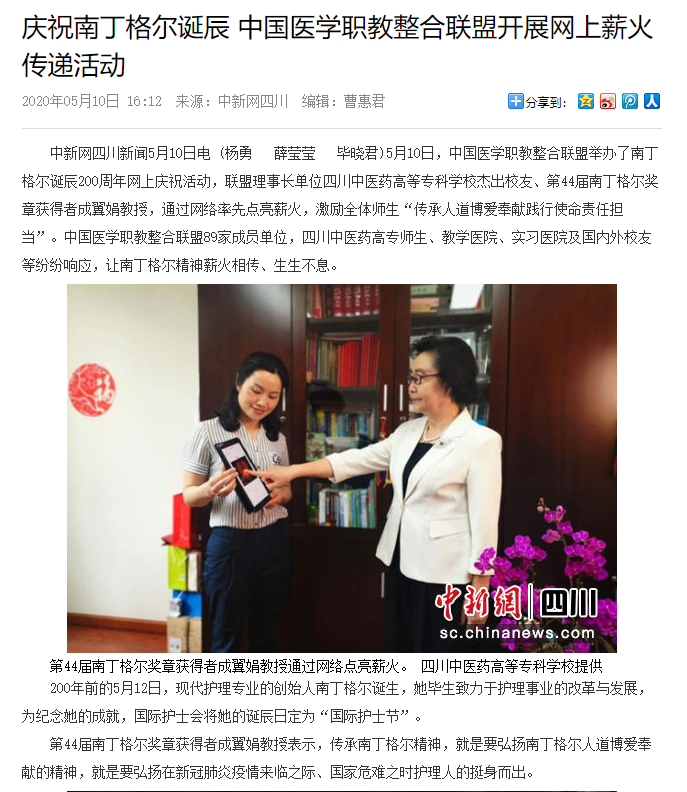 媒体报道 当前位置: 首页 >> 媒体报道 >> 正文 中国新闻网:庆祝南丁格尔诞辰 中国医学职教整合联盟开展网上薪火传递活动 发布日期:2020-05-10 点击: 链接地址:http://www.sc.chinanews.com/bwbd/2020-05-10/127703.html 上一篇:川报观察:护士节快到了,他们这样点亮薪火 下一篇:绵阳广播电视台《天天800》:国际护士节 致敬白衣天使