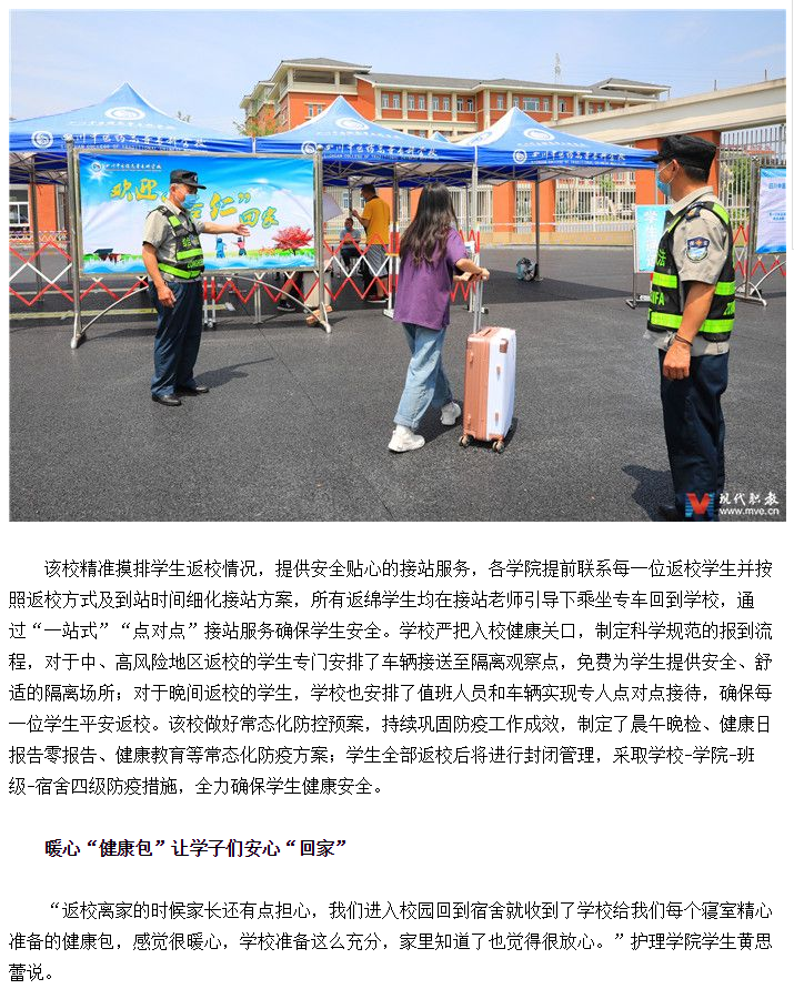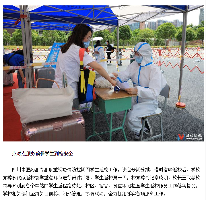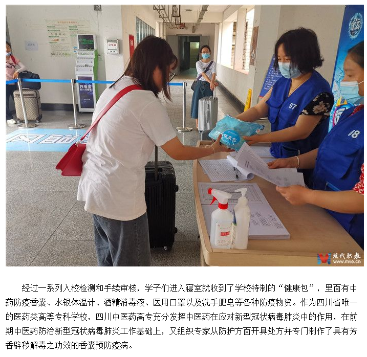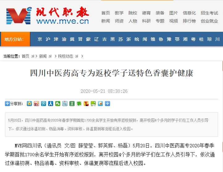媒体报道 当前位置: 首页 >> 媒体报道 >> 正文 现代职业教育网:四川中医药高专为返校学子送特色香囊护健康 发布日期:2020-05-21 点击: 链接地址:http://www.mve.cn/html/2020/yxdt_0521/45291.html#10006-weixin-1-52626-6b3bffd01fdde4900130bc5a2751b6d1 上一篇:绵阳广播电视台《天天800》:学生返校 满满都是欢喜 下一篇:今日头条:四川发布“首届新时代四川高校十大党建创新案例暨十大基层党组织实践案例”