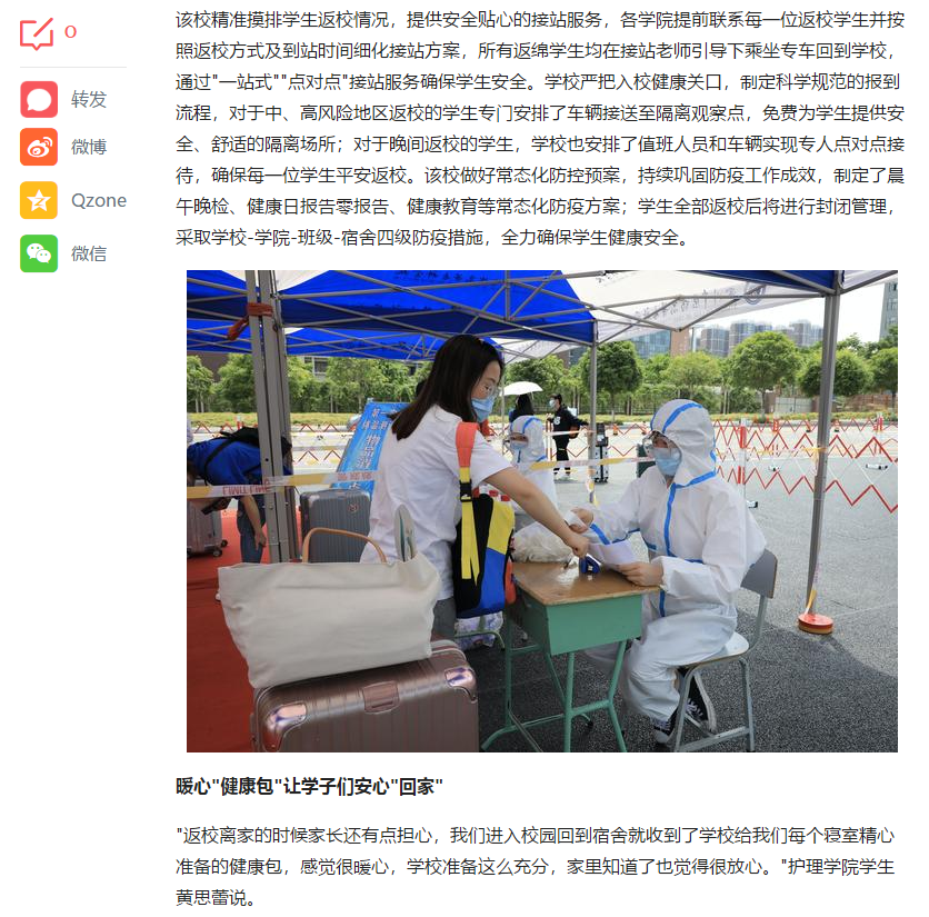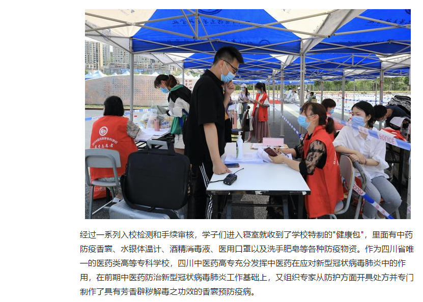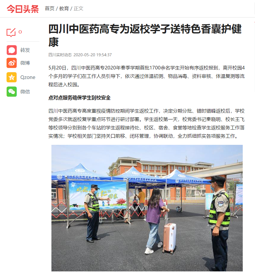 媒体报道 当前位置: 首页 >> 媒体报道 >> 正文 今日头条:四川中医药高专为返校学子送特色香囊护健康 发布日期:2020-05-20 点击: 链接地址:https://www.toutiao.com/i6828893532351103496/?tt_from=weixin&utm_campaign=client_share&wxshare_count=1×tamp=1589975896&app=news_article&utm_source=weixin&utm_medium=toutiao_android&req_id=202005201958160101941000474D02B237&group_id=6828893532351103496 上一篇:绵阳广播电视台《绵阳新闻》:刘超在检查督导高校复学复课准备工作时强调 始终把师生生命安全和身体健康放在首位 坚决确保复学复课教育教学安全稳定 下一篇:绵阳广播电视台《天天800》:学生返校 满满都是欢喜