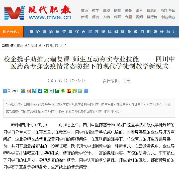 媒体报道 当前位置: 首页 >> 媒体报道 >> 正文 现代职业教育网:校企携手助推云端复课 师生互动夯实专业技能 发布日期:2020-06-12 点击: 链接地址:http://www.mve.cn/html/2020/yxdt_0612/45523.html#10006-weixin-1-52626-6b3bffd01fdde4900130bc5a2751b6d1 上一篇:今日头条:四川发布“首届新时代四川高校十大党建创新案例暨十大基层党组织实践案例” 下一篇:今日头条:四川中医药高专开出“心灵处方”筑牢校园常态化疫情防控心理防线