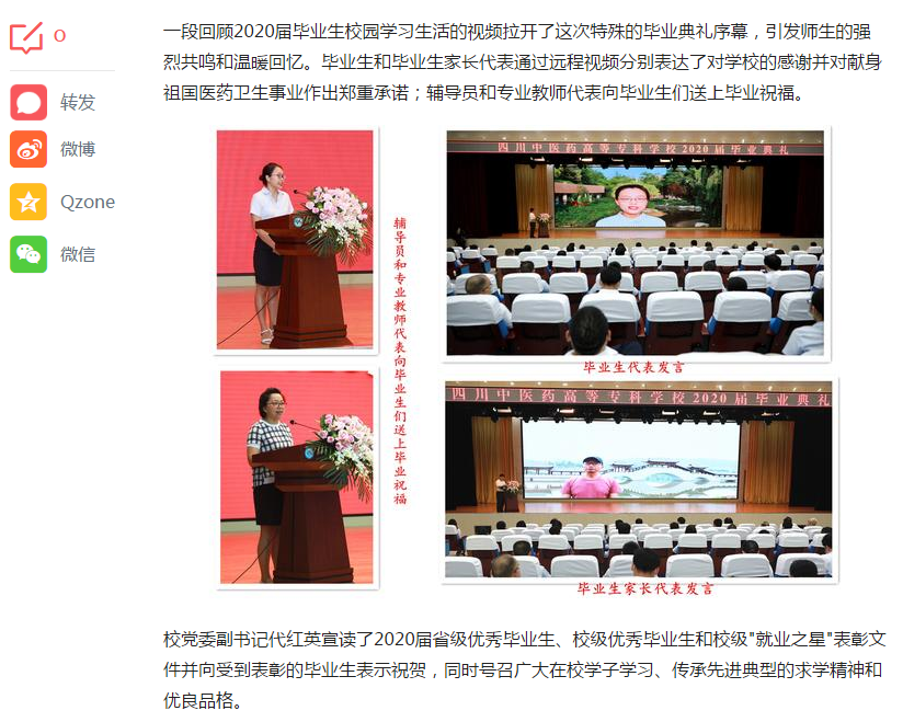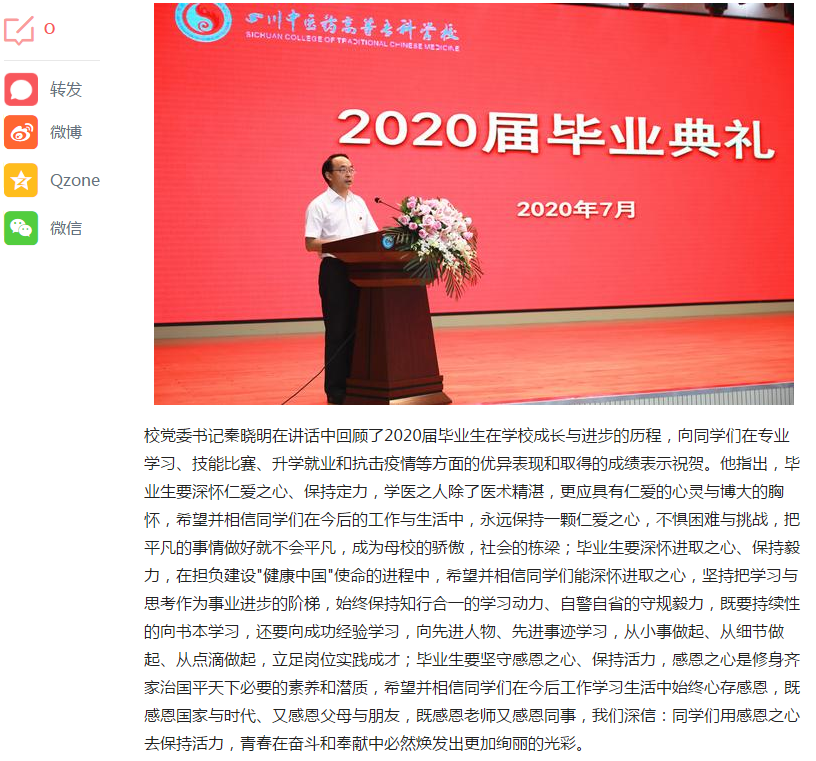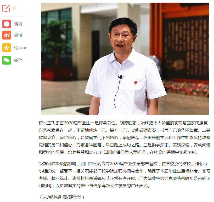 媒体报道 当前位置: 首页 >> 媒体报道 >> 正文 今日头条:四川中医药高专2020届毕业典礼:母校隔空送祝福 学子云端话别离 发布日期:2020-07-10 点击: 链接地址:https://www.toutiao.com/i6847718492762800648/?tt_from=weixin&utm_campaign=client_share&wxshare_count=1×tamp=1594363429&app=news_article&utm_source=weixin&utm_medium=toutiao_android&use_new_style=1&req_id=202007101443490100260770891B11E9C4&group_id=6847718492762800648 上一篇:今日头条:四川中医药高专开出“心灵处方”筑牢校园常态化疫情防控心理防线 下一篇:中国新闻网:四川中医药高专举行2020届“云毕业典礼”