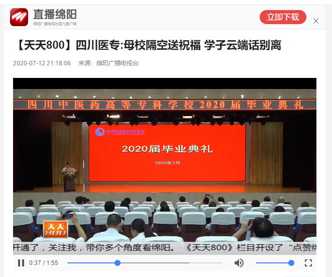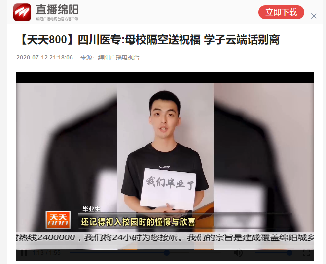 媒体报道 当前位置: 首页 >> 媒体报道 >> 正文 绵阳广播电视台:四川医专:母校隔空送祝福 学子云端话别离 发布日期:2020-07-12 点击: … 链接地址:http://mob.zbmy.myntv.cn/index.php?m=content&c=index&a=show&catid=130&id=247571&from=singlemessage&uuid=630d5e39c3232f7784fc5f38960e720d 上一篇:中国新闻网:四川中医药高专举行2020届“云毕业典礼” 下一篇:手机报:省卫健委给四川医专送锦旗
